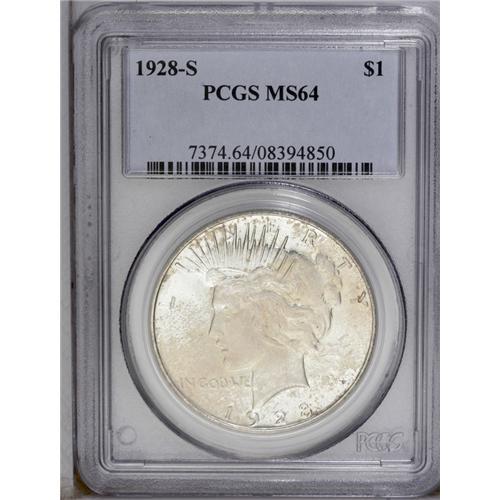 <B>1928-S<img border='0' src='http://www.heritagecoins.com/images/star.gif' width=10 height=10>$1> MS64 PCGS.</B></I> Well struck and lustrous, with attractively original coloration that varies from bright silver to pastel terra cotta shadings. The few tiny nicks seem inadequate to explain the MS64 grade assessment. A conservatively graded near-Gem.