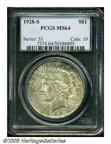 <B>1928-S<S$1> MS64 PCGS.</B></I> Well struck and vibrantly lustrous, with a rich layer of speckled, original coloration over the obverse, and a few minor grazes and coin-to-coin marks on each side of the piece. A very pleasing near-Gem, from an issue that becomes exceedingly scarce at the Gem level of preservation.
