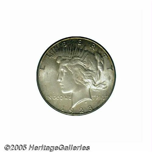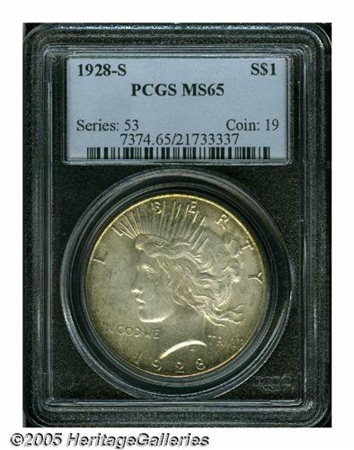 <B>1928-S<S$1> MS65 PCGS.</B></I> Well struck with a frosty silver-gray finish that is little affected by coin-to-coin contact and bits of light golden peripheral color. The advent of third party certification has been good to the 1928-S Peace Dollar, elevating it to its proper place at or near the top of the condition rarity scale in the series. Gems have proven to be quite elusive and almost non-existent any finer. Population: 31 in 65, 1 finer (6/05).