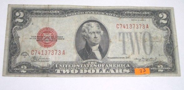 1928 SERIES D $2 RED SEAL CERTIFICATE SERIAL # C74137373A *RARE NICE BILL*!! ***Coin, Currency & All Items Listed in this auction - Grades, Conditions and Values are not Safe Deposit Coins LLC Responsibilty. Grades, Condition and Values are determined by Consigner(s) & Buyers ONLY