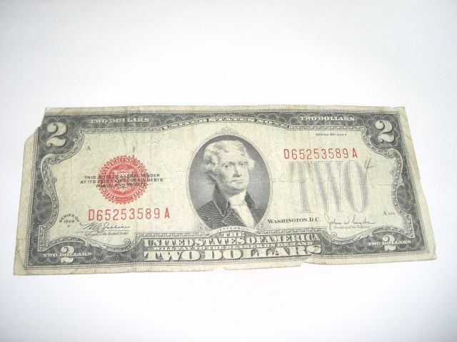 1928 SERIES F $2 RED SEAL NOTE *SERIAL # D65253589A*!! ***Coin, Currency & All Items Listed in this auction - Grades, Conditions and Values are not Safe Deposit Coins LLC Responsibilty. Grades, Condition and Values are determined by Consigner(s) & Buyers ONLY***