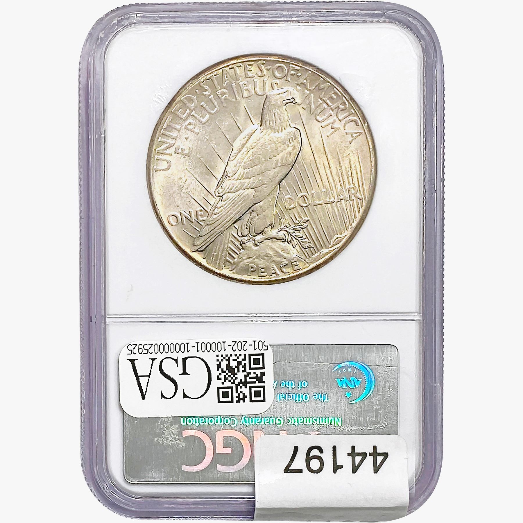 l. All non-certified coins and currency are guaranteed genuine, but are not guaranteed as to grade, since grading is a matter of opinion, an art and not a science, and therefore the description rendered by GSA or any third-party grading service may not agree with the opinion of others (including trained experts), and the same expert may not grade the same item with the same grade at two different times. GSA may, but is not obligated to, express an opinion as to non-certified numismatic items, in GSA’s opinion, or by its employees’ experience and the current interpretation of the American Numismatic Association’s standards as of the date the catalog was prepared. There is no guarantee or warranty expressed or implied that the grading opinions utilized by GSA, if any, will meet the standards of any grading service at any time in the future.