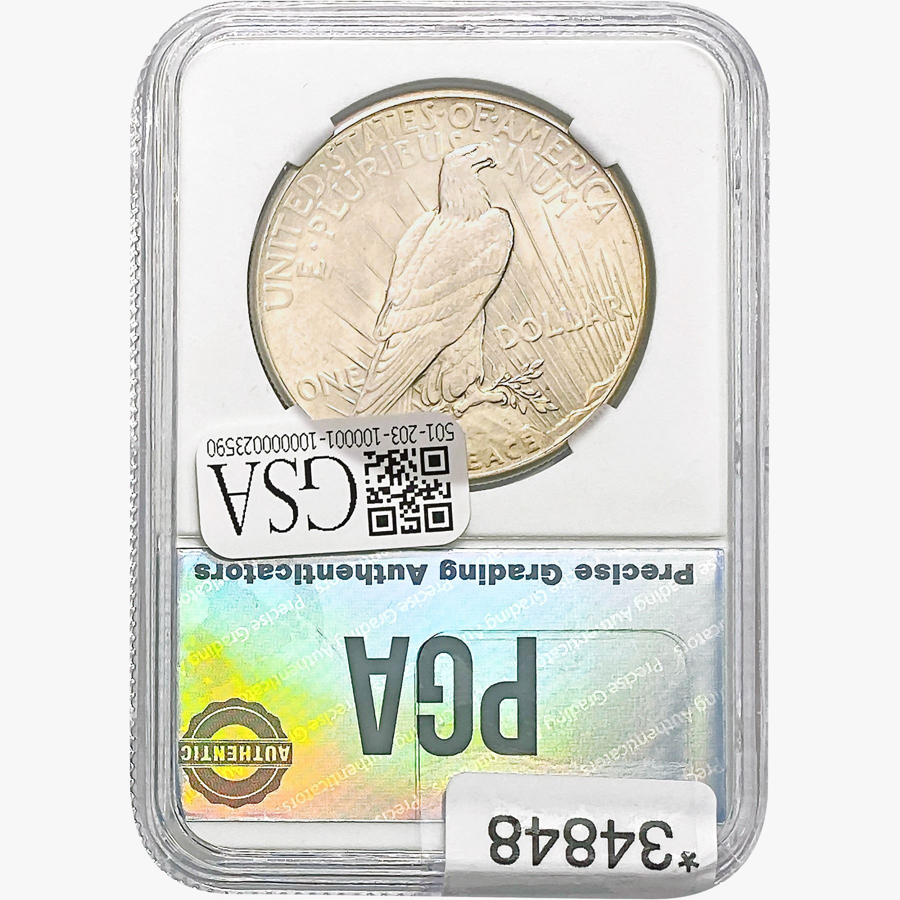 COINS AND CURRENCY LISTED IN GSA’S CATALOG AS GRADED AND ENCAPSULATED BY PCGS, NGC, ANACS, ICG, PCGS CURRENCY, PMG, PCGS BANKNOTE GRADING, CMC OR ANY OTHER THIRD-PARTY GRADING SERVICE ARE LIKEWISE SOLD “AS-IS” EXCEPT AS EXPRESSLY SET FORTH HEREIN. ALL THIRD-PARTY GRADING SERVICE GUARANTEES, INCLUDING AUTHENTICITY, ARE THE SOLE RESPONSIBILITY OF THE THIRD-PARTY GRADING SERVICE AND NOT WARRANTIES OR GUARANTEES OF GSA. BIDDERS SHOULD CONTACT THESE THIRD-PARTY GRADING SERVICES DIRECTLY WITH RESPECT TO ANY CLAIMS OR QUESTIONS THEY MAY HAVE CONCERNING THEIR GUARANTEES AND WARRANTIES. BIDDERS ACKNOWLEDGE AND AGREE THAT AUCTIONEER IS NOT BOUND BY OR LIABLE FOR ANY OPINION OR CERTIFICATION BY ANY THIRD-PARTY GRADING SERVICE. REMOVAL OF A PRODUCT FROM ITS PROTECTIVE CASING OR HOLDER OR ALTERATION OF ANY COIN HOLDER WAIVES ALL RIGHTS CONCERNING THE PRODUCT CONTAINED THEREIN.