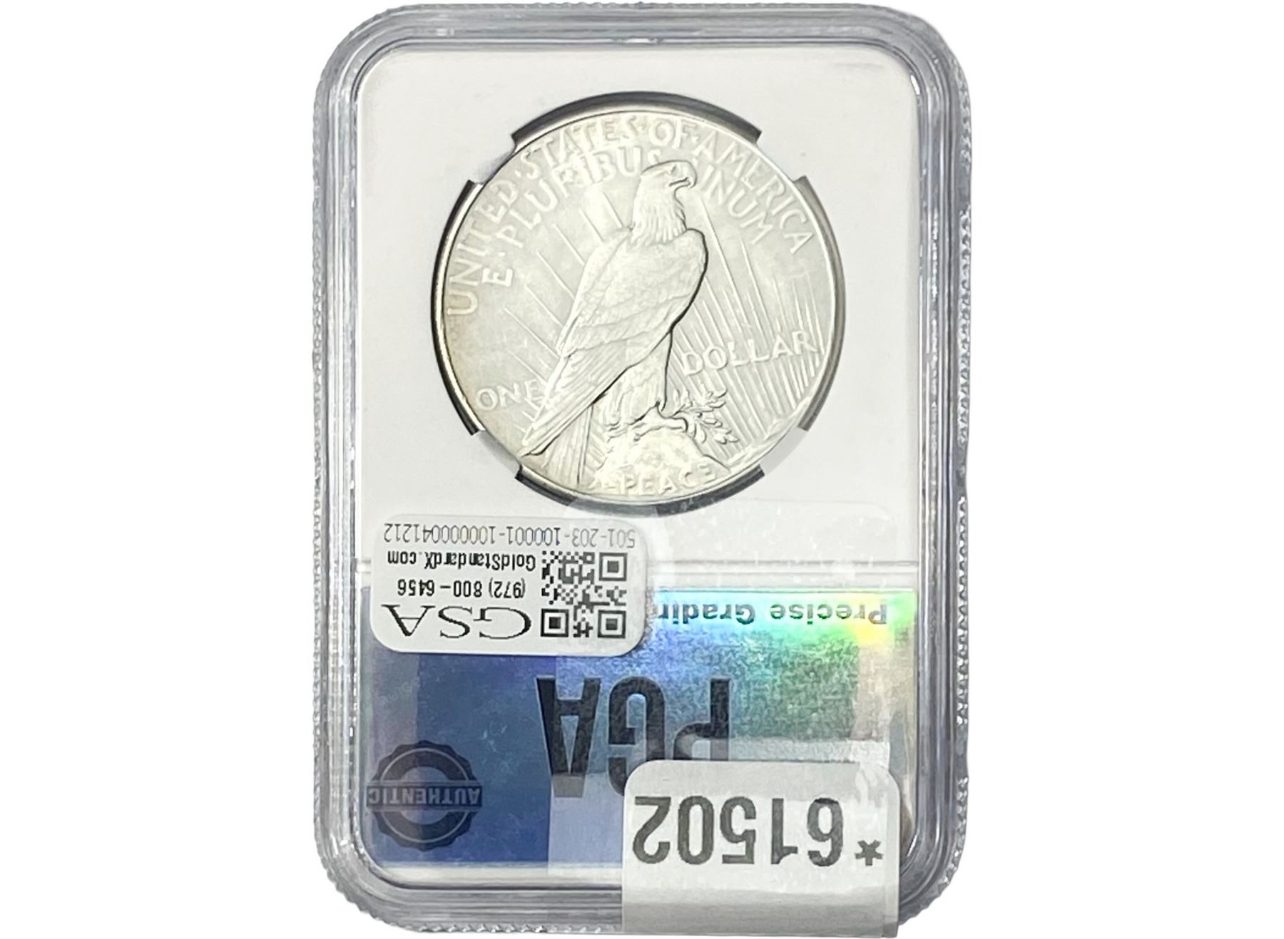 l. All non-certified coins and currency are guaranteed genuine, but are not guaranteed as to grade, since grading is a matter of opinion, an art and not a science, and therefore the description rendered by GSA or any third-party grading service may not agree with the opinion of others (including trained experts), and the same expert may not grade the same item with the same grade at two different times. GSA may, but is not obligated to, express an opinion as to non-certified numismatic items, in GSA’s opinion, or by its employees’ experience and the current interpretation of the American Numismatic Association’s standards as of the date the catalog was prepared. There is no guarantee or warranty expressed or implied that the grading opinions utilized by GSA, if any, will meet the standards of any grading service at any time in the future.