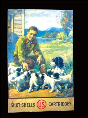 1928 US Cartridge Co. Calendar Top, Joe Burgess artist. Depicts man with dog and puppies. Store stamp in upper right corner, for arms and munitions. Excellent original condition. Framed and matted. 15 1/2 X 24 inches.