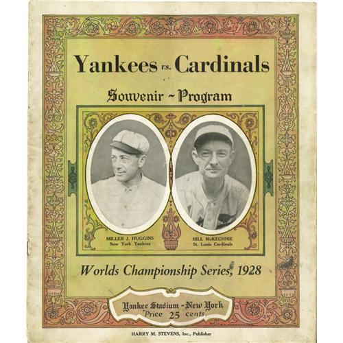 <B>1928 World Series Program (New York).</B></I> The Yanks avenged their Series loss to the St. Louis Cardinals two years earlier this October, sweeping the red birds in four games to earn the squad's third World Championship. This very tough program was issued for either the first or second game of the Series, games played at the young ballpark that was coming to be known as The House that Ruth Built. A mild degree of wear is to be expected, with wear and light toning around the edges and some wrinkling at the center from having been folded lengthwise ages ago, but the program is still solidly bound and complete with no tearing or significant staining. A very solid example of a tough and desirable publication.