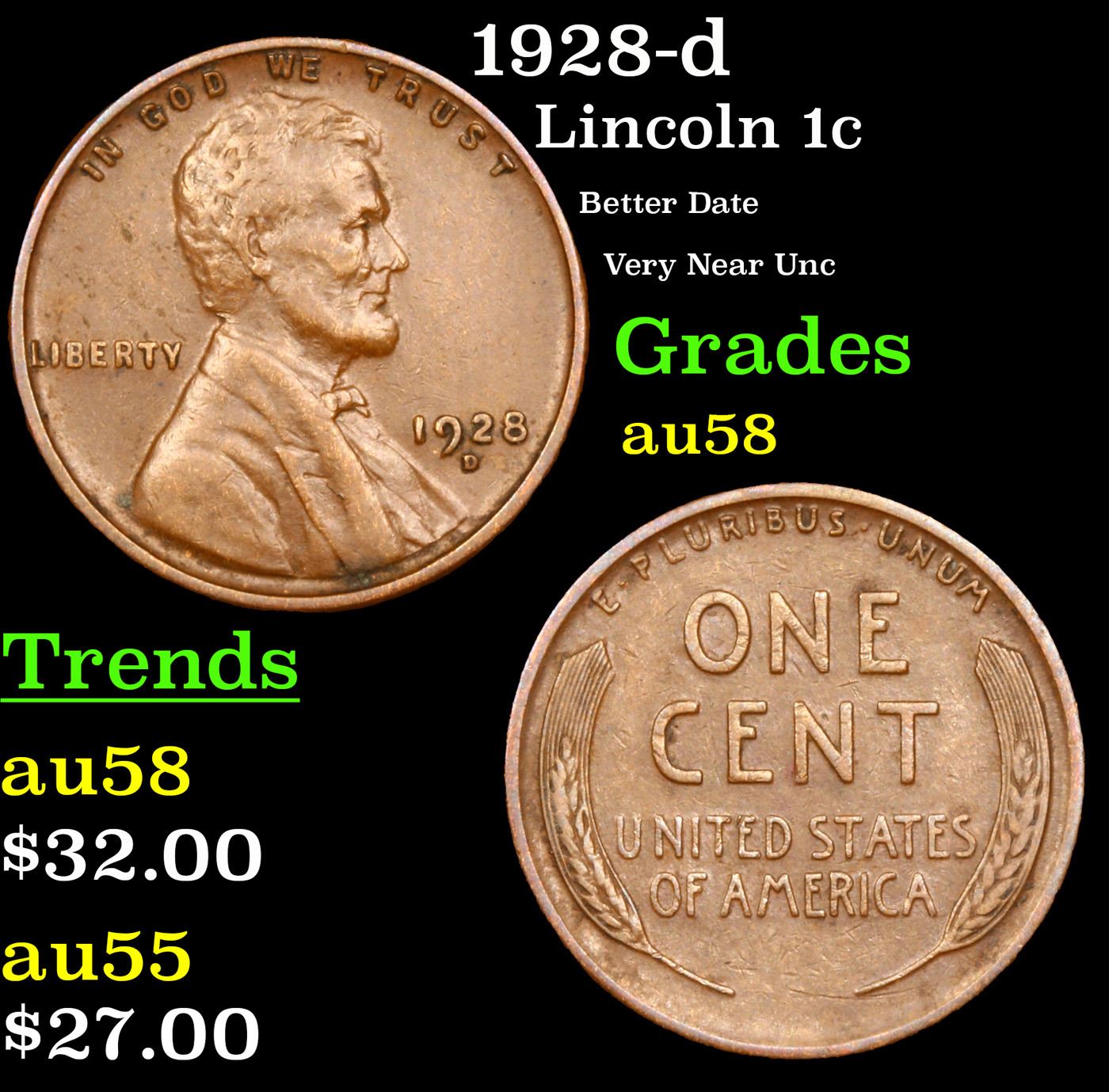 1928-d Lincoln Cent 1c Grades Choice AU/BU Slider.