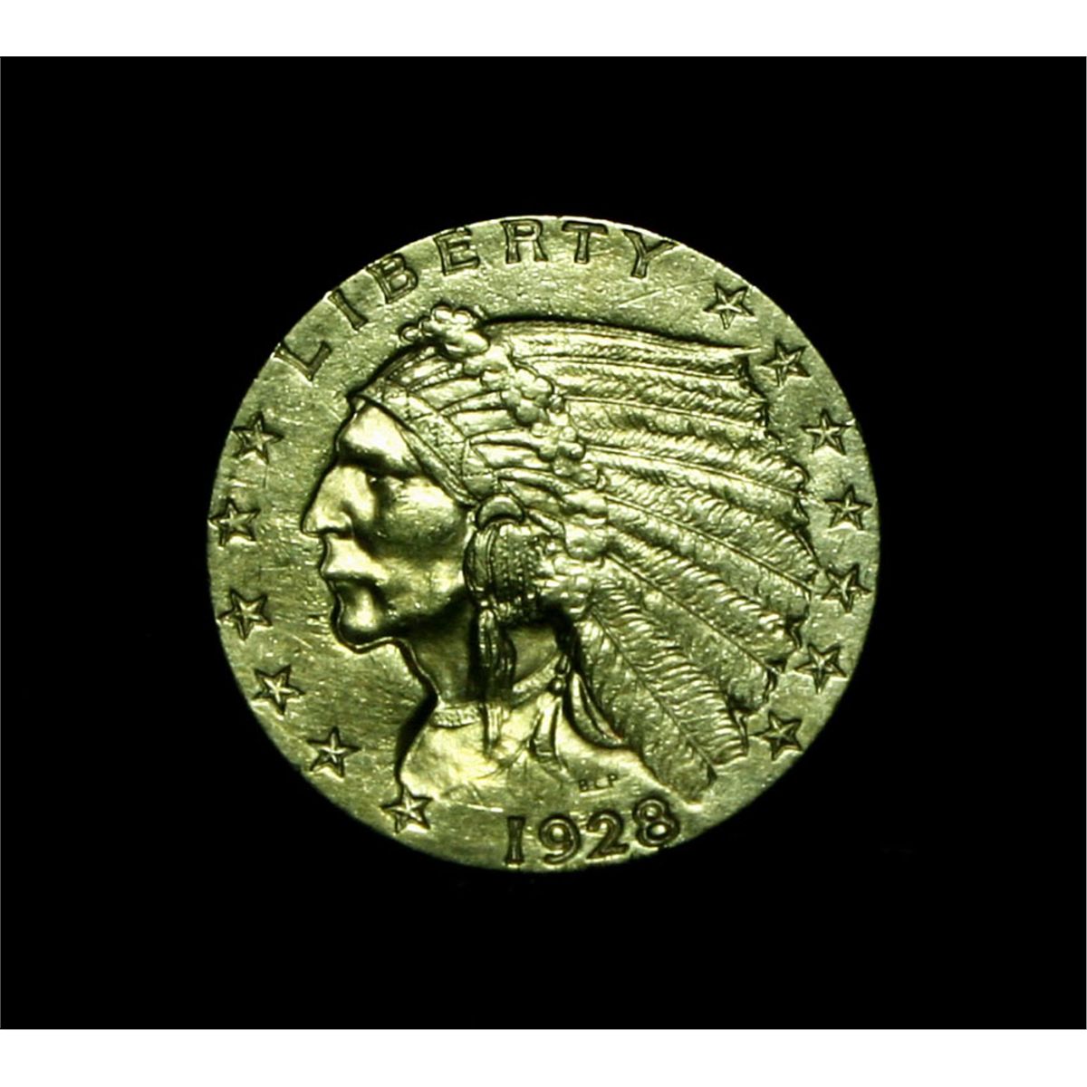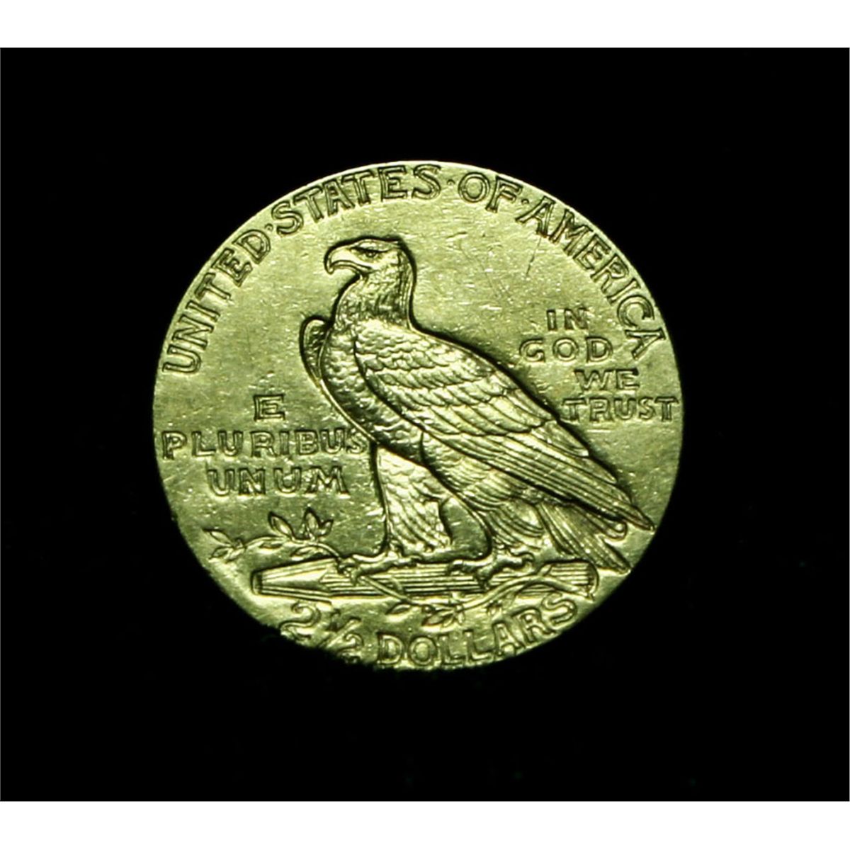 Pretty and Lustrous example of this late date $2 1/2 gold Indian, with the terrific incuse design. NGC's Price Guide lists an ms62 at $563 and the Wholesale Greysheet lists ms62 at $435+. Estimated Value $500