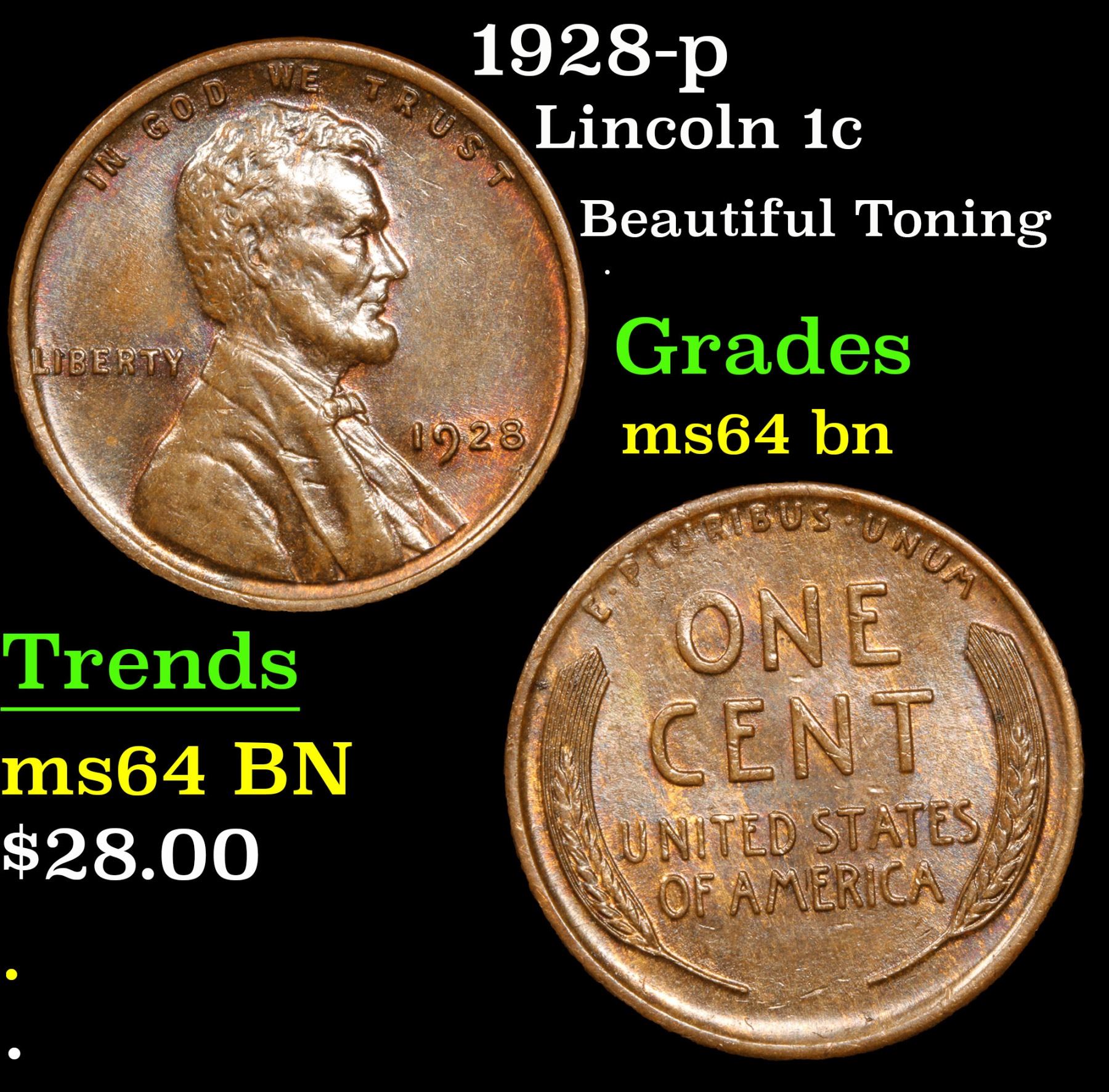 1928-p Lincoln Cent 1c Grades Choice Unc BN. Beautiful Toning