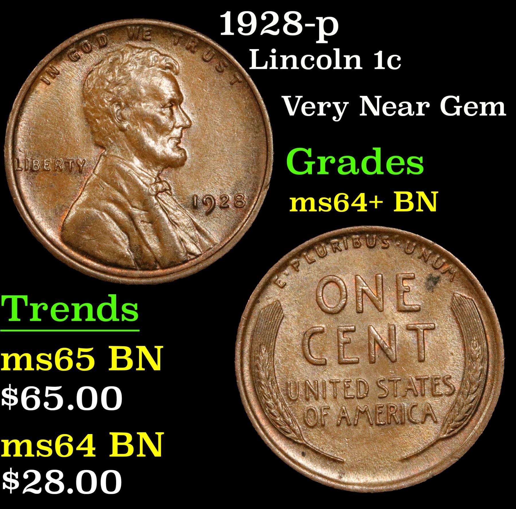 1928-p Lincoln Cent 1c Grades Choice+ Unc BN. Very Near Gem
