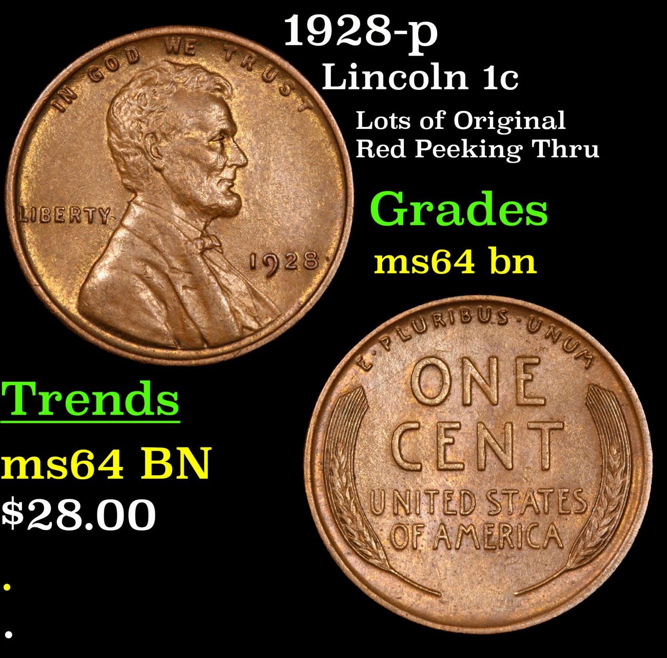 1928-p Lots of Original Red Peeking Thru . Lincoln Cent 1c Grades Choice Unc BN.