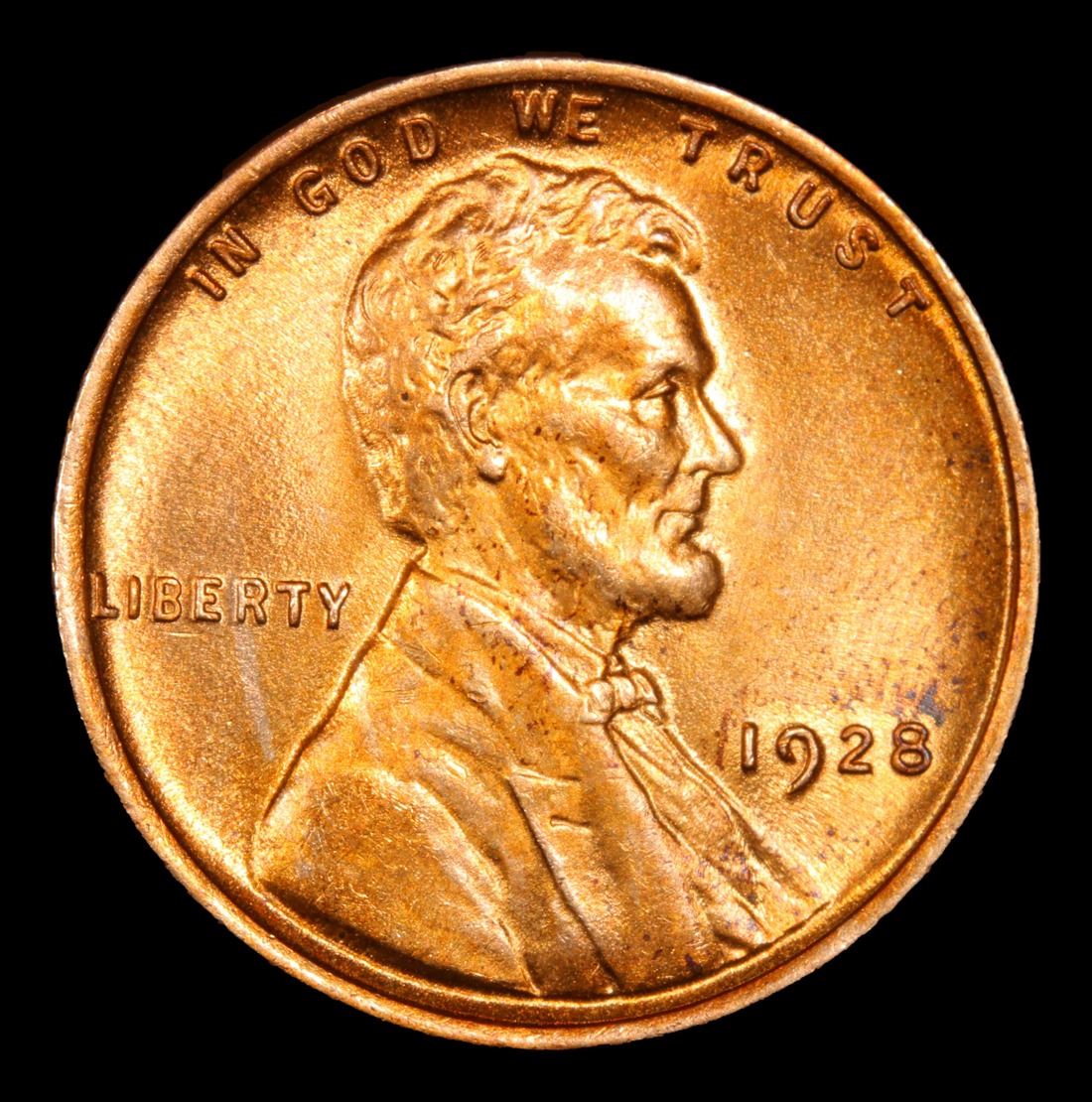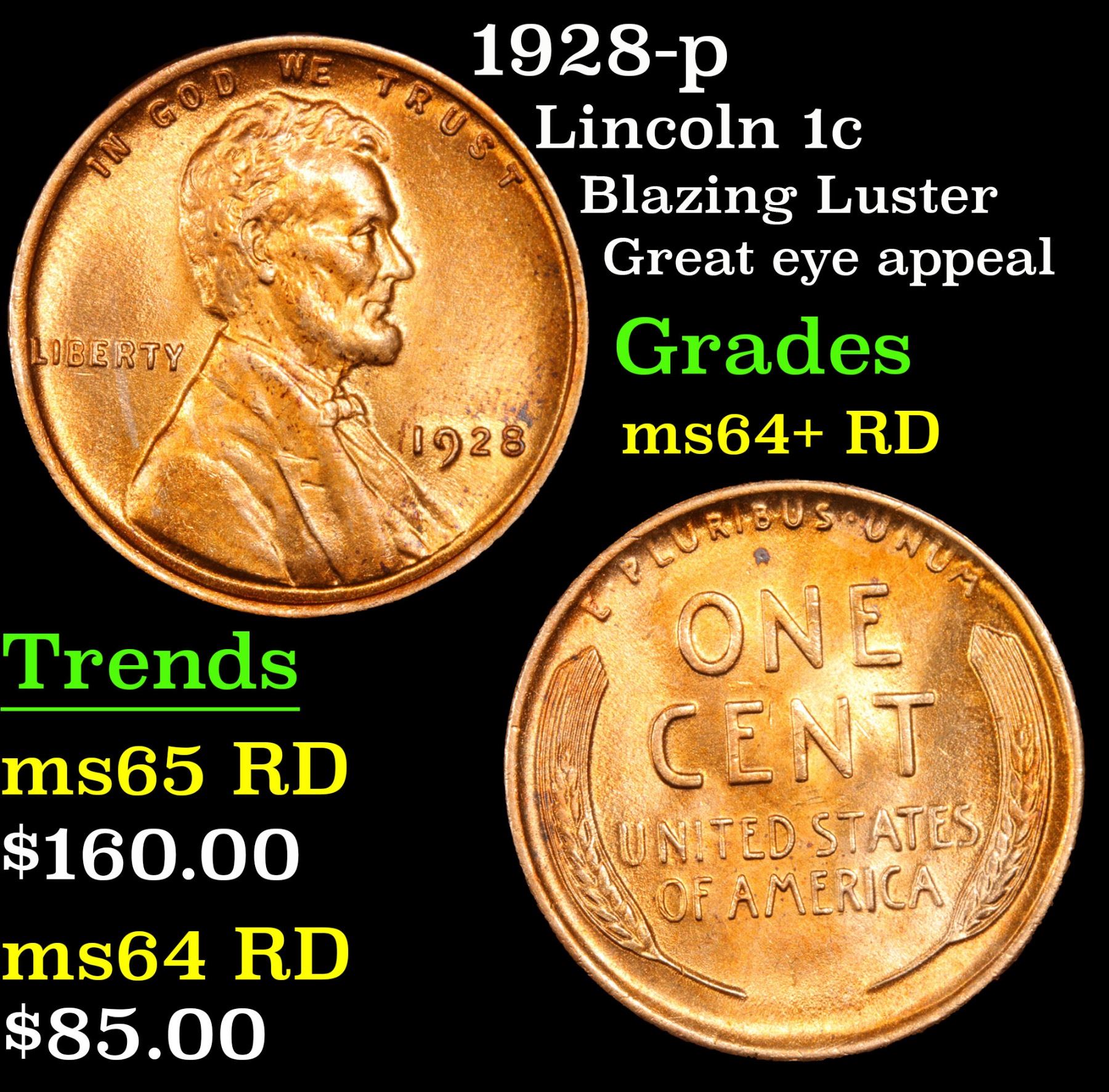 1928-p Lincoln Cent 1c Grades Choice+ Unc RD. Blazing Luster; Great eye appeal