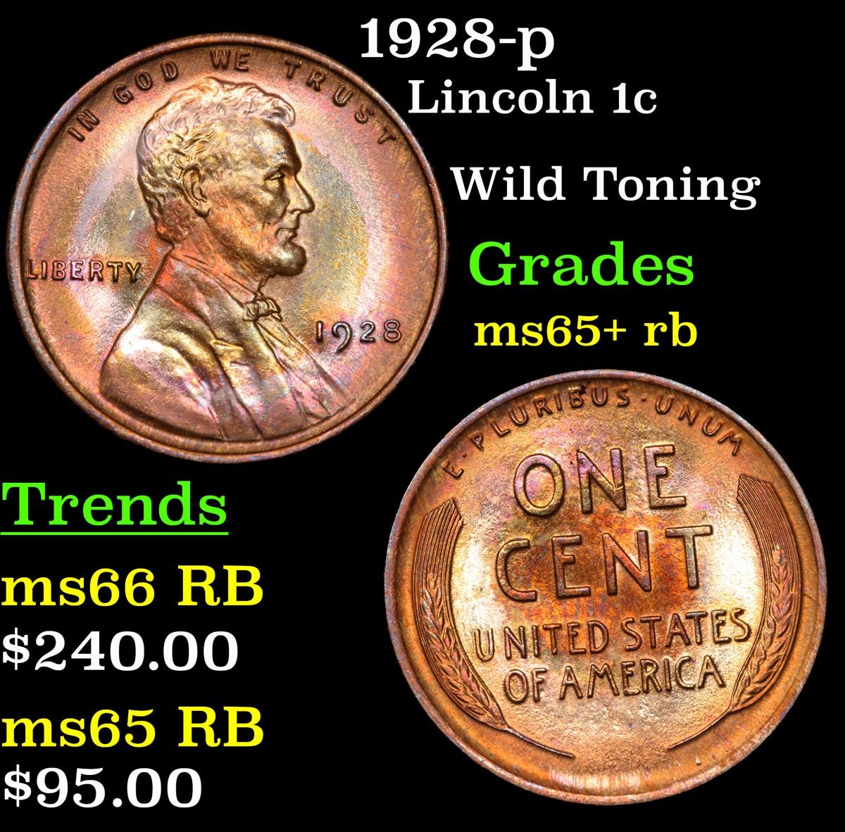 1928-p Wild Toning . Lincoln Cent 1c Grades Gem+ Unc RB.