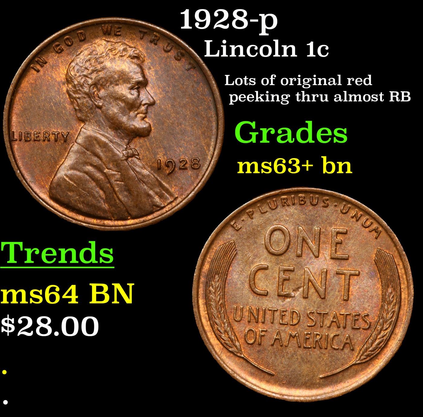 1928-p Lincoln Cent 1c Grades Select+ Unc BN.