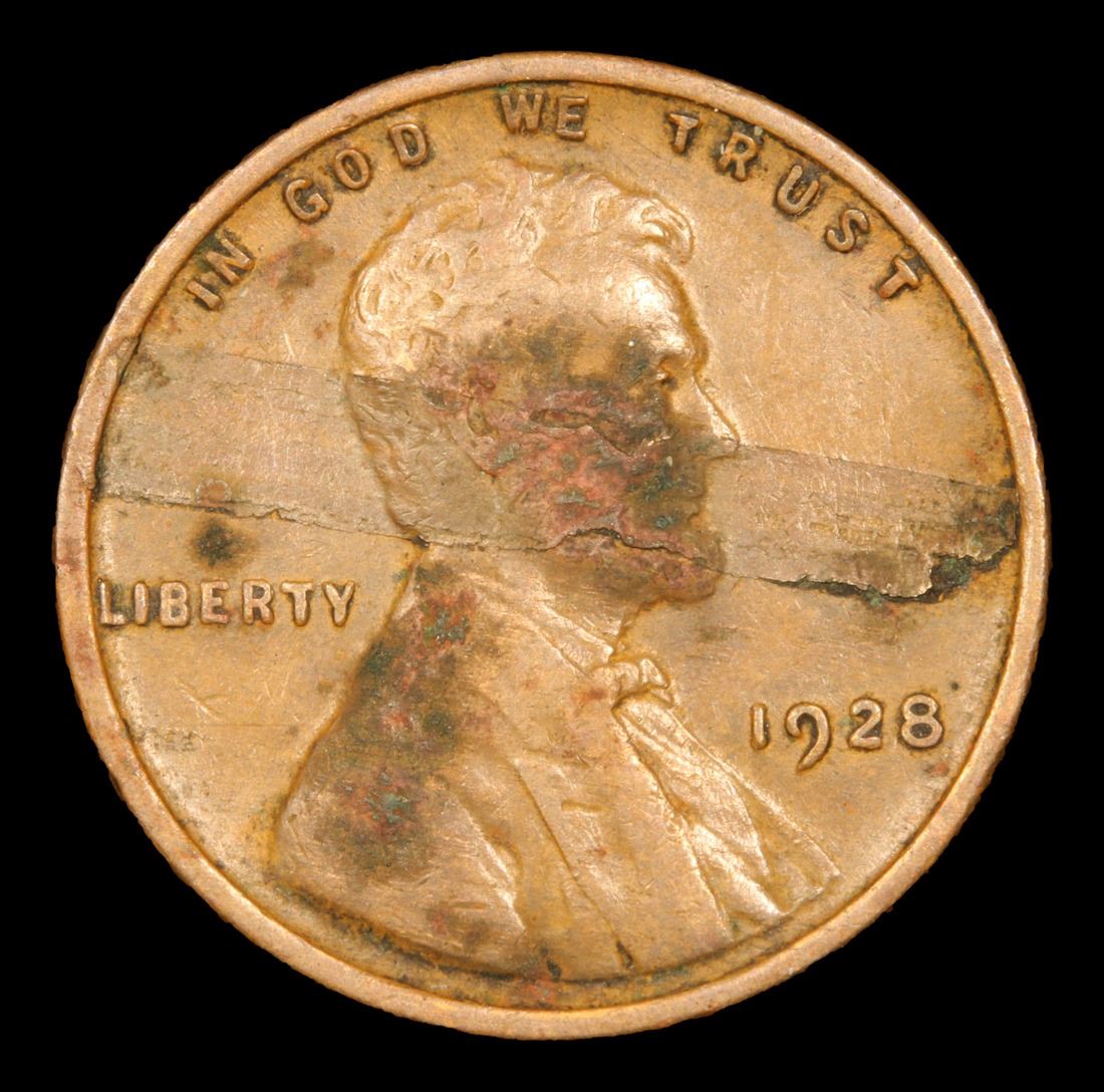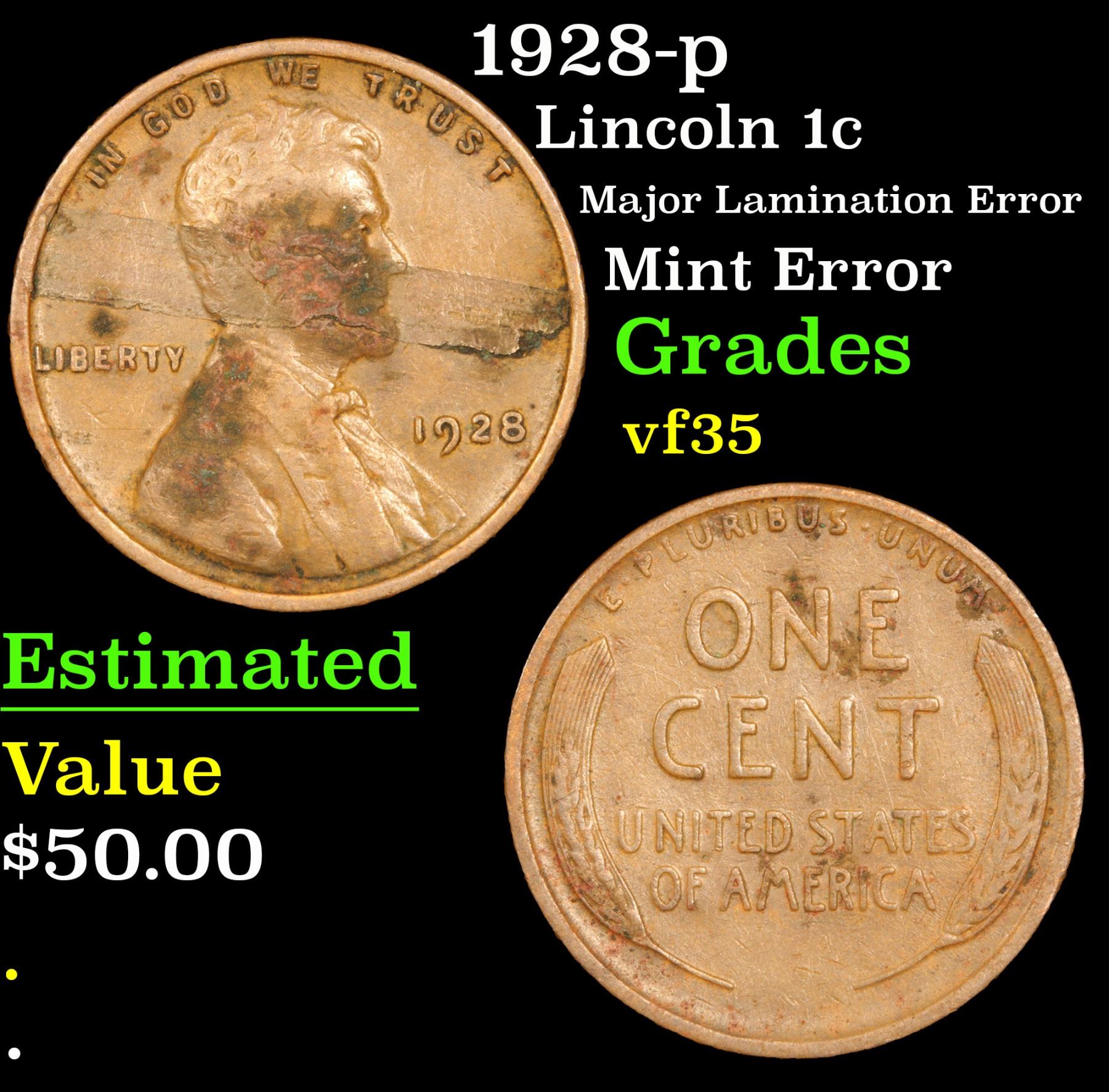 1928-p Lincoln Cent 1c Grades vf++. Major Lamination Error; Mint Error
