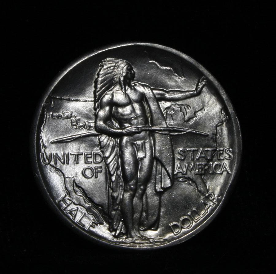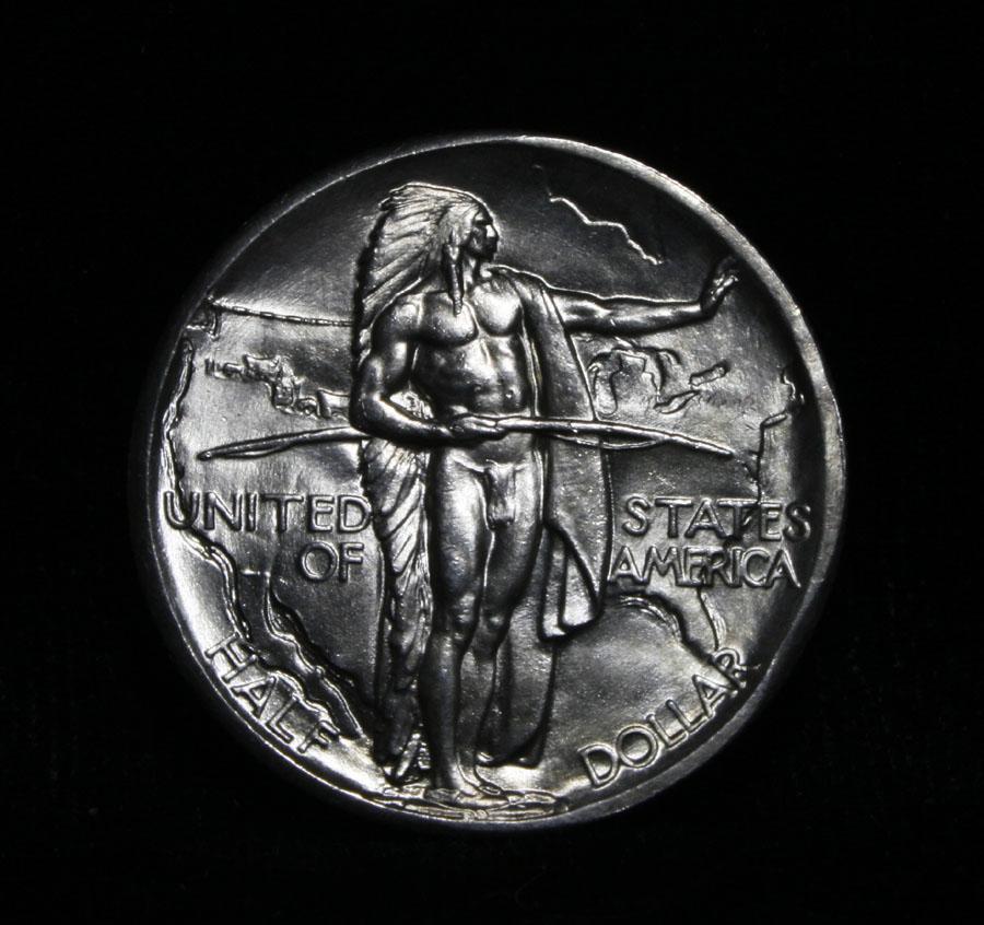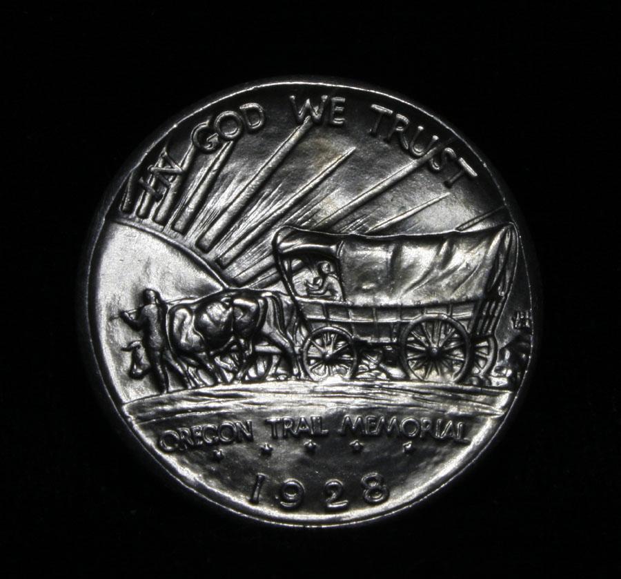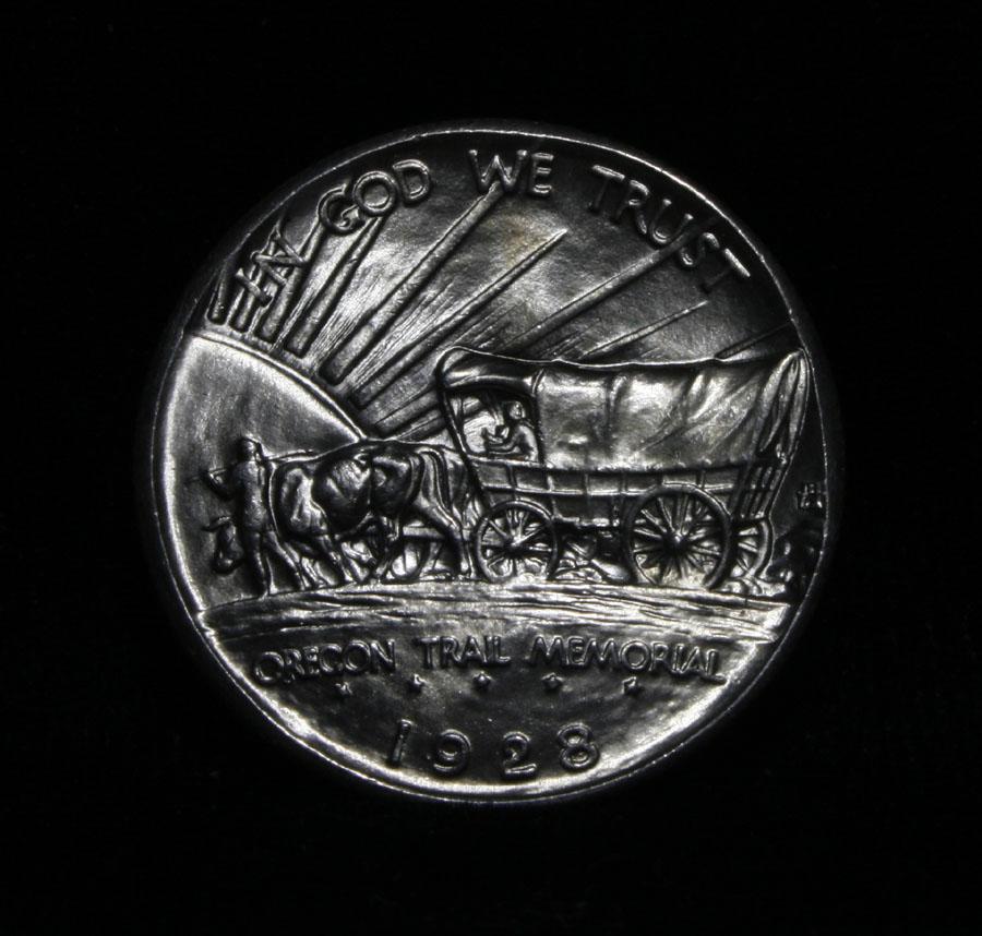 Stunning white example. A Great and Lustrous Gem. The 28-p is a much scarcer date in this series. We have only offered one other before. One of the most beautifully designed coins in American History, Designed by the same engraver that designed the Buffalo Nickel, This coin Commemorates the Oregon Trail that brought thousands of Intrepid pioneers to the West in the 1830's and 40's. When Buying an Oregon Trail Commemorative, regardless of year and mint the Points to first show wear are the Indian’s hand and thigh on the obverse and the ox and the bows of the wagon’s cover on the reverse, these are the high points. Coin World's Coin Values lists ms66 at $550 and The Wholesale Greysheet lists ms66 at $410. Estimated Value $500.