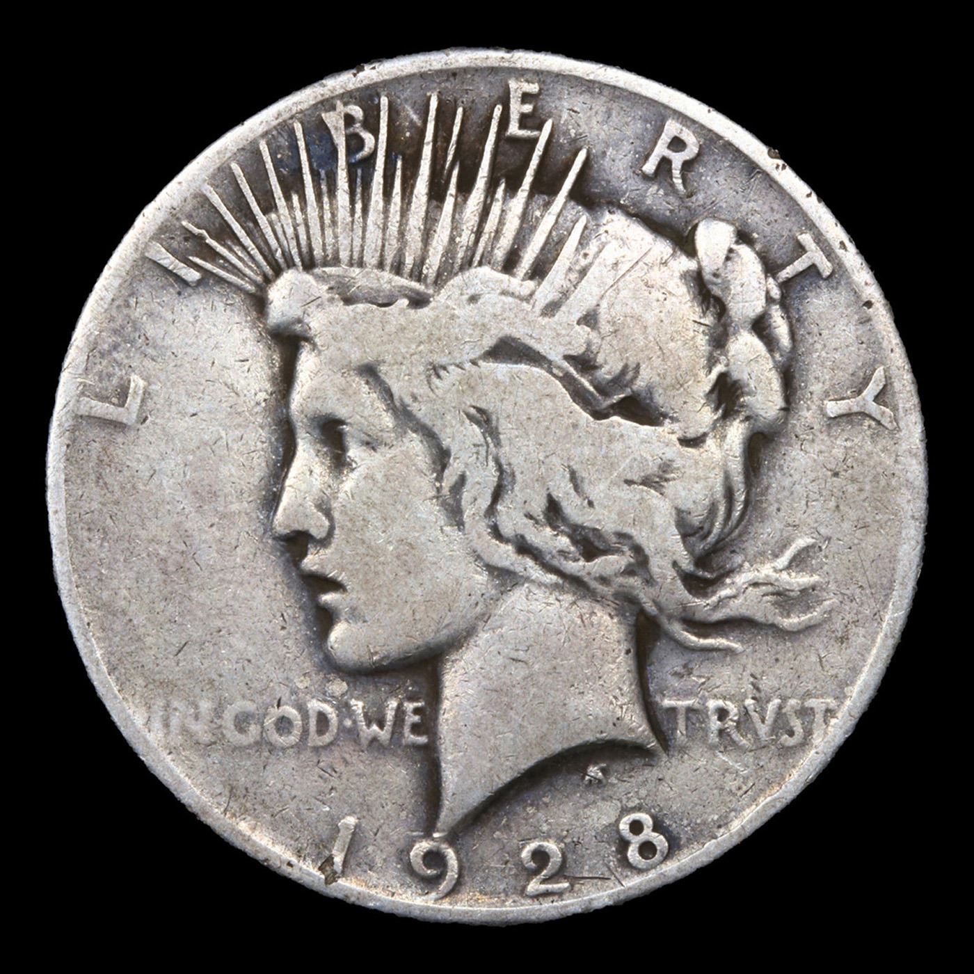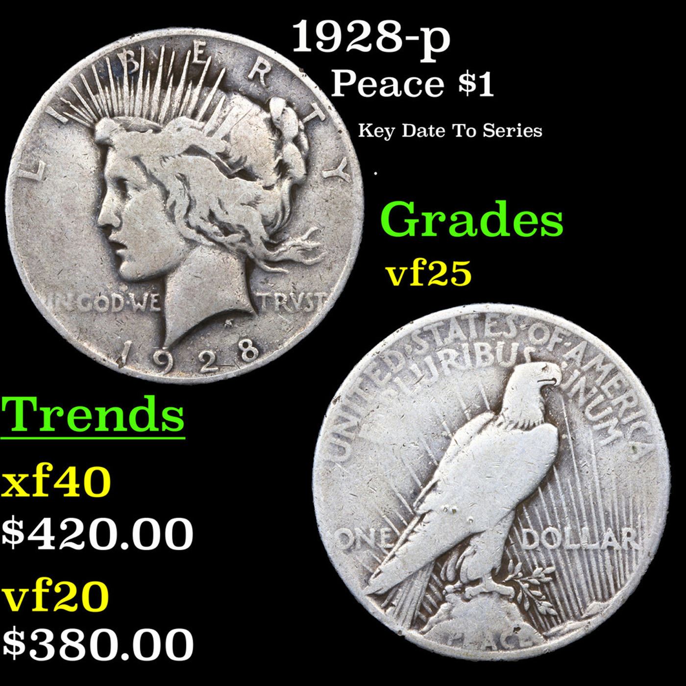 1928-p Peace Dollar $1 Grades vf+. Incredibly scarce date, lowest mintage in the entire Peace Dollar Series. Scarce in all grades.