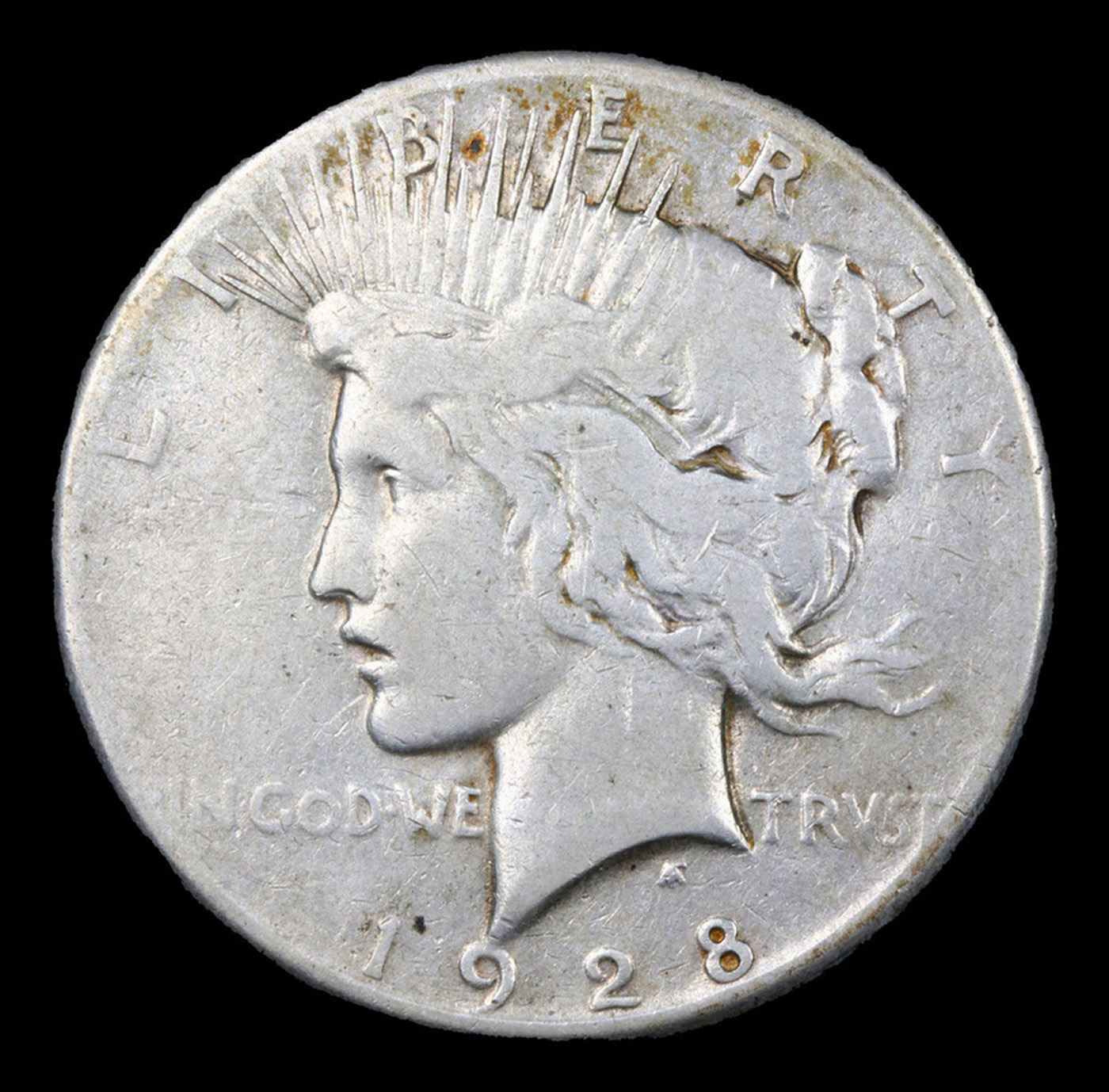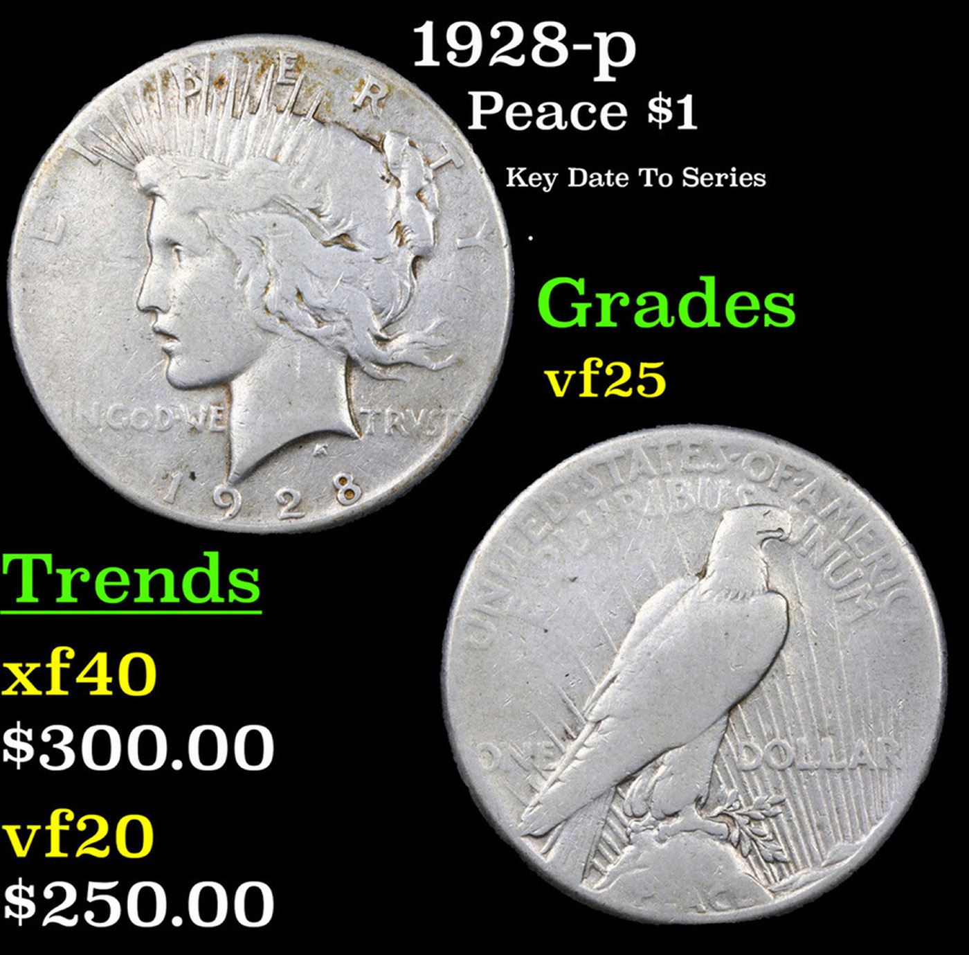 1928-p Peace Dollar $1 Grades vf+. Incredibly scarce date, lowest mintage in the entire Peace Dollar Series. Scarce in all grades.