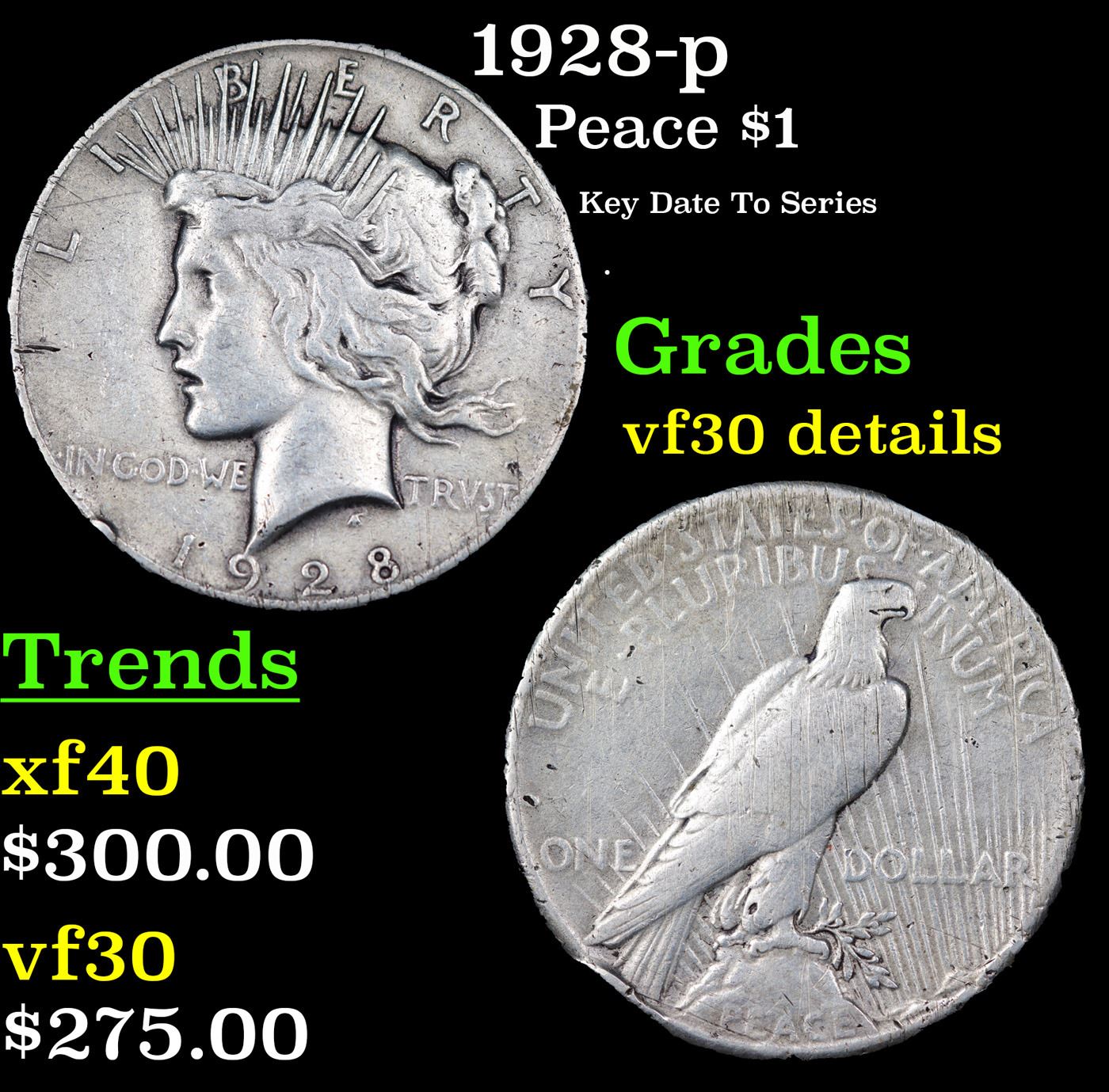 1928-p Peace Dollar $1 Grades vf++. Incredibly scarce date, lowest mintage in the entire Peace Dollar Series. Scarce in all grades.