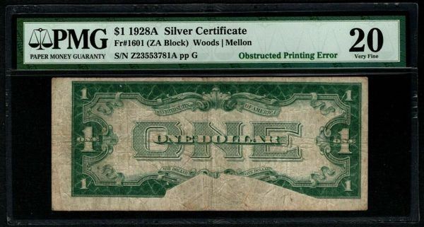 One 1928A $1 ERROR Silver Certificate PMG 20.