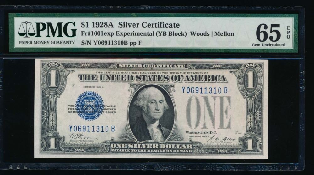 One 1928A $1 Experimental Silver Certificate PMG 65EPQ.
