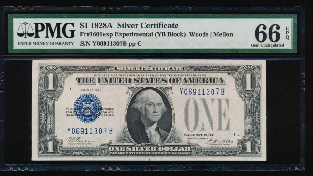 One 1928A $1 Experimental Silver Certificate PMG 66EPQ.