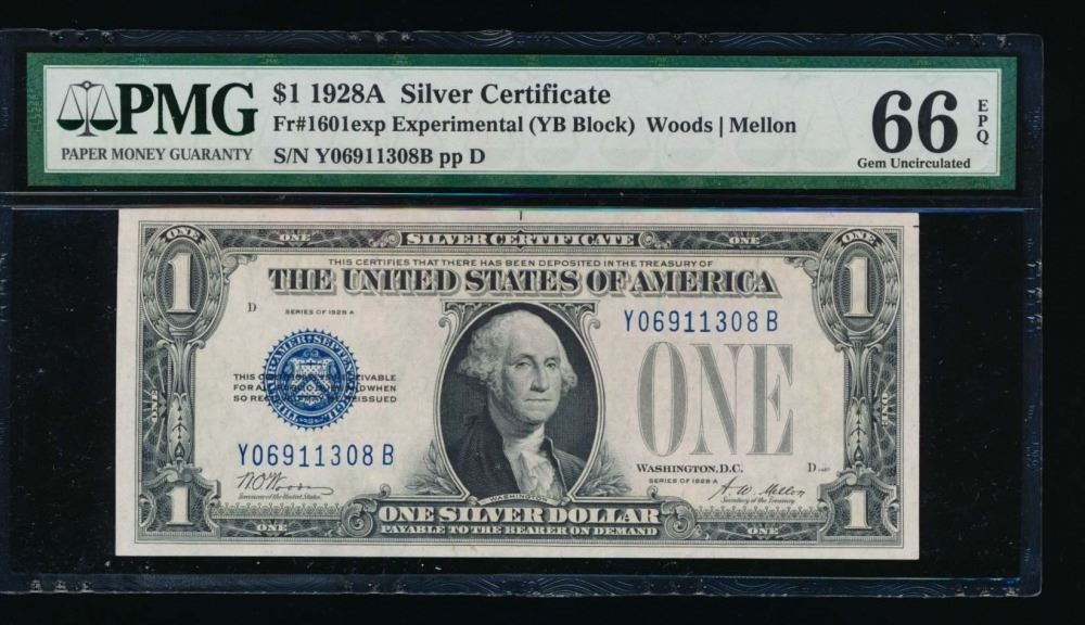 One 1928A $1 Experimental Silver Certificate PMG 66EPQ.