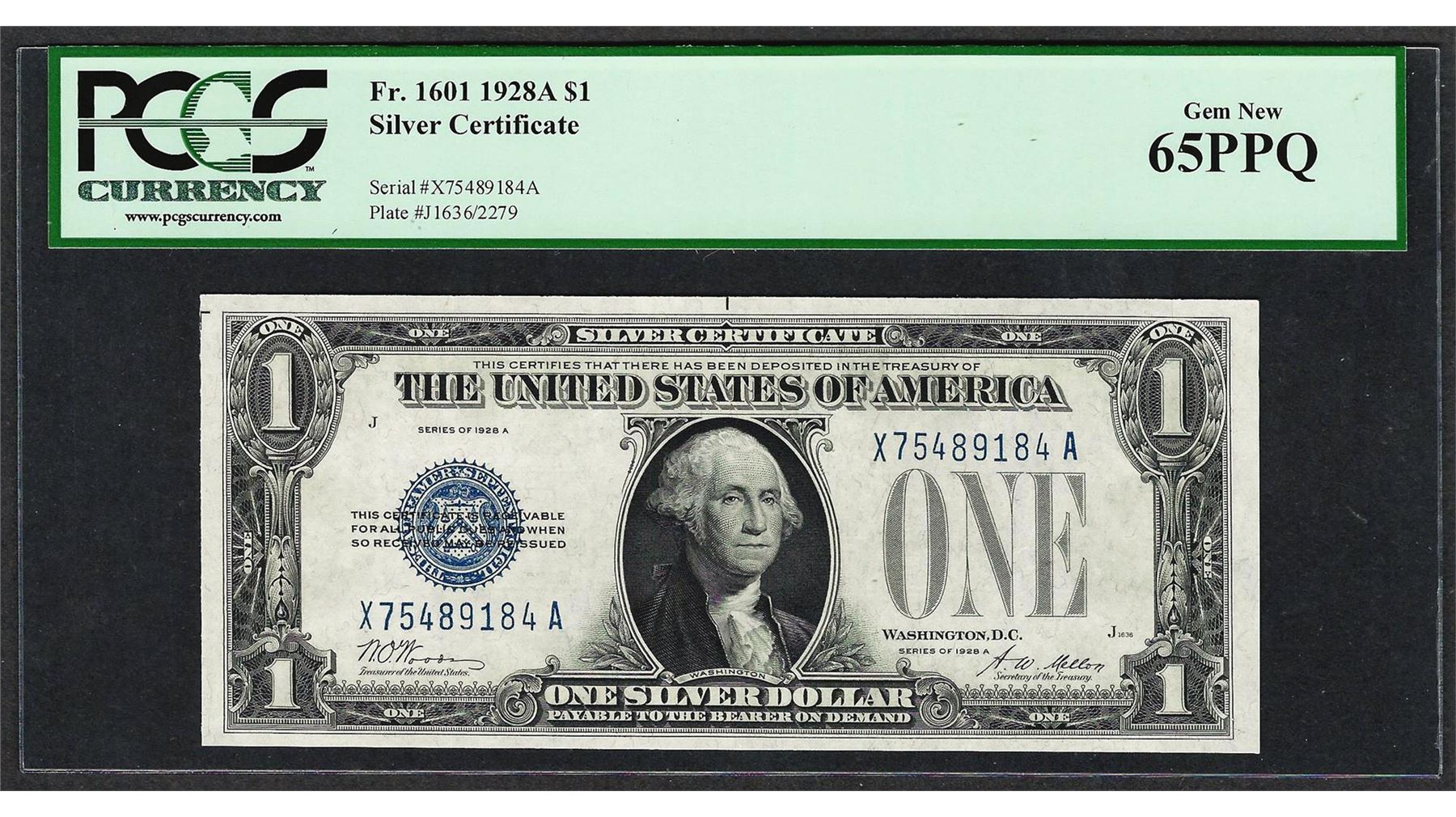 One 1928A $1 Funnyback Silver Certificate Note Fr.1601 PCGS Gem New 65PPQ. PCGS Graded.