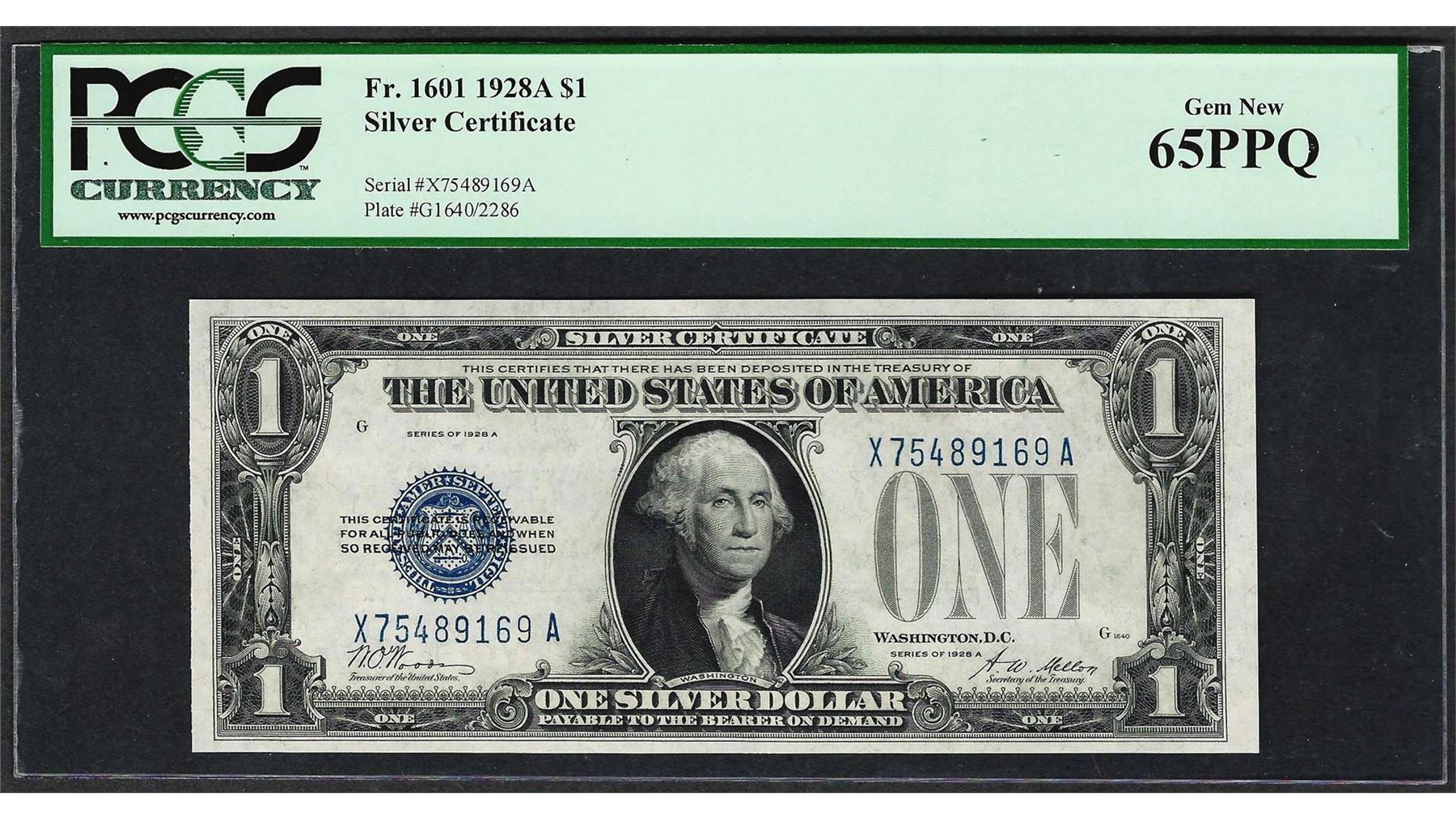 One 1928A $1 Funnyback Silver Certificate Note Fr.1601 PCGS Gem New 65PPQ. PCGS Graded.
