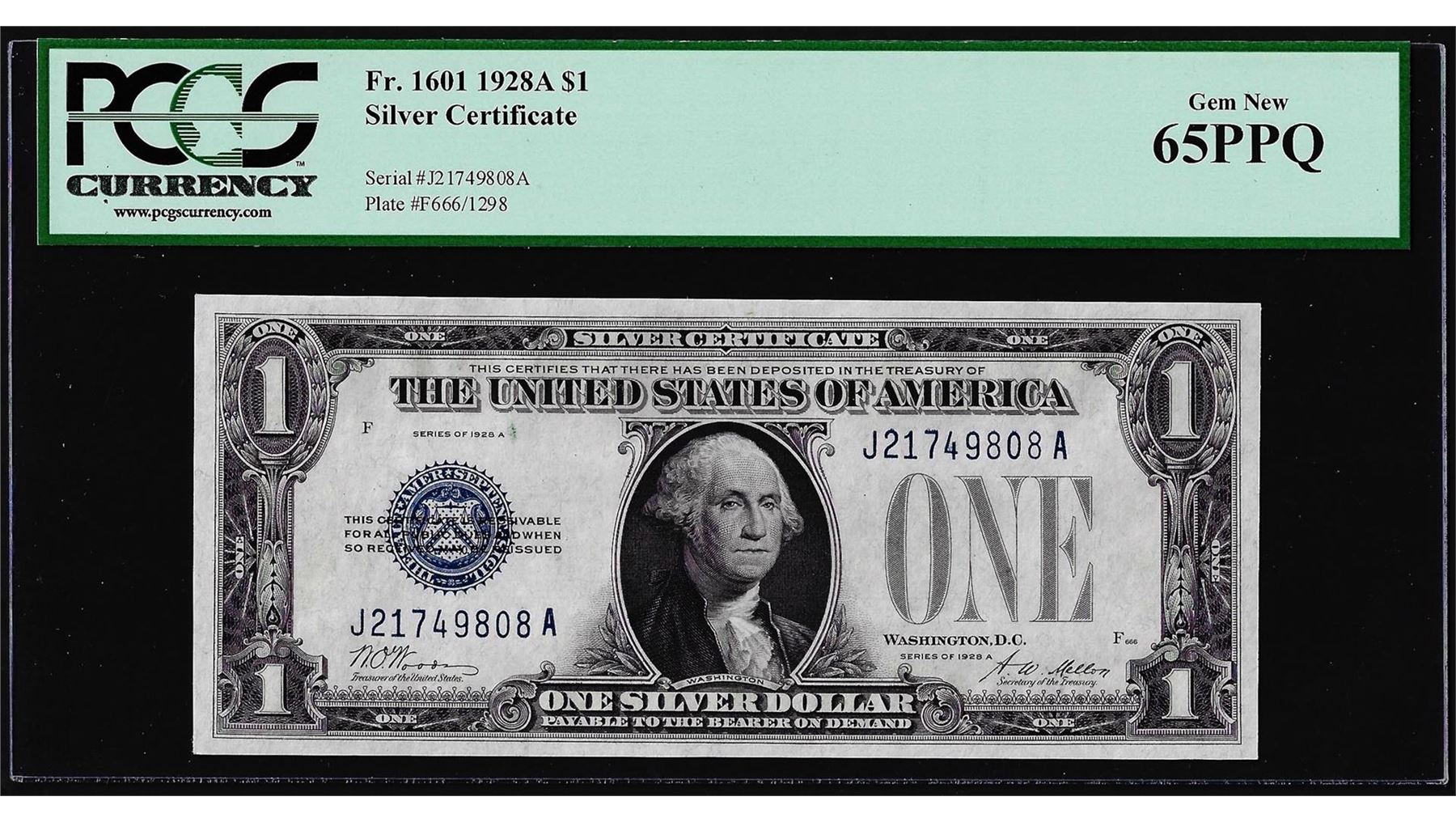 One 1928A $1 Funnyback Silver Certificate Note Fr.1601 PCGS Gem New 65PPQ. PCGS Graded.