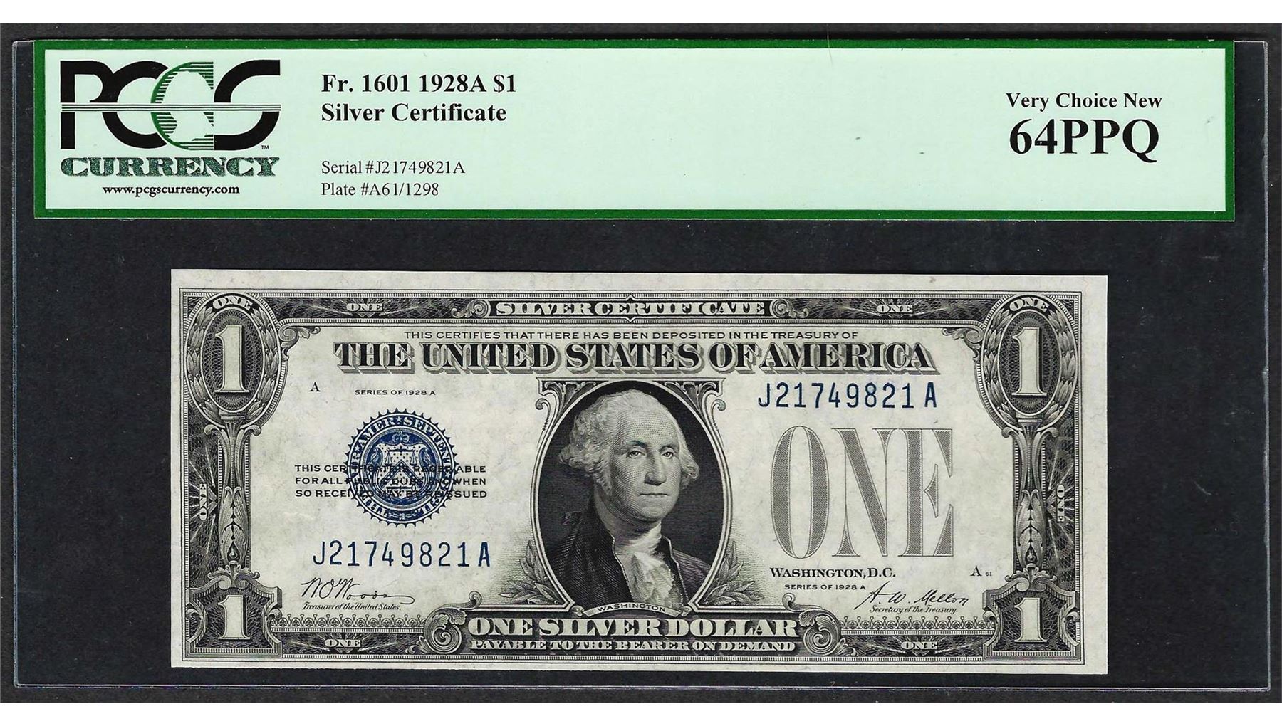 One 1928A $1 Funnyback Silver Certificate Note Fr.1601 PCGS Very Choice New 64PPQ. PCGS Graded.