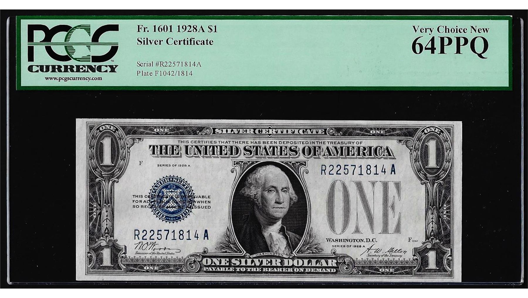 One 1928A $1 Funnyback Silver Certificate Note Fr.1601 PCGS Very Choice New 64PPQ. PCGS Graded.