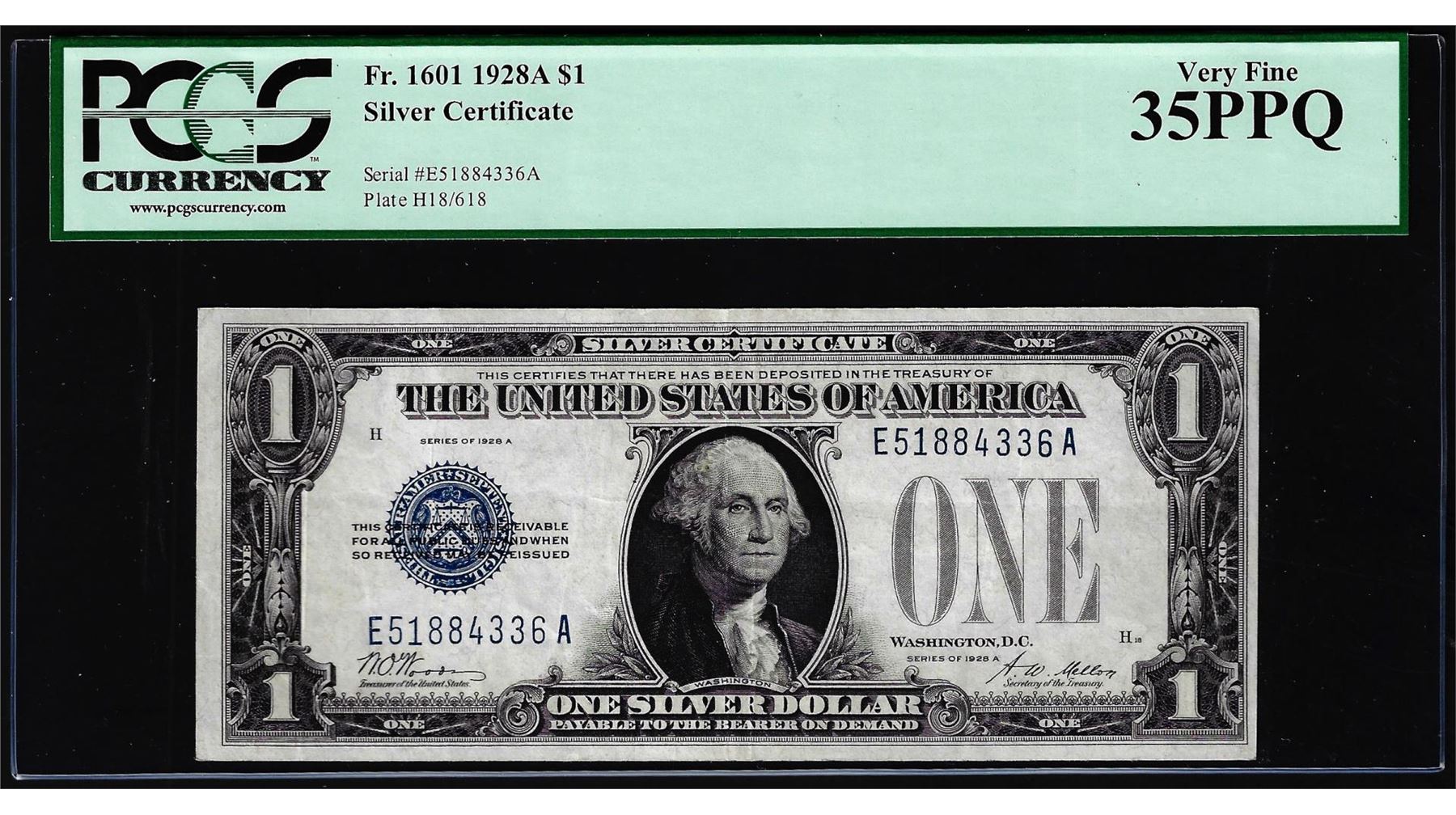 One 1928A $1 Funnyback Silver Certificate Note Fr.1601 PCGS Very Fine 35PPQ. PCGS Graded.