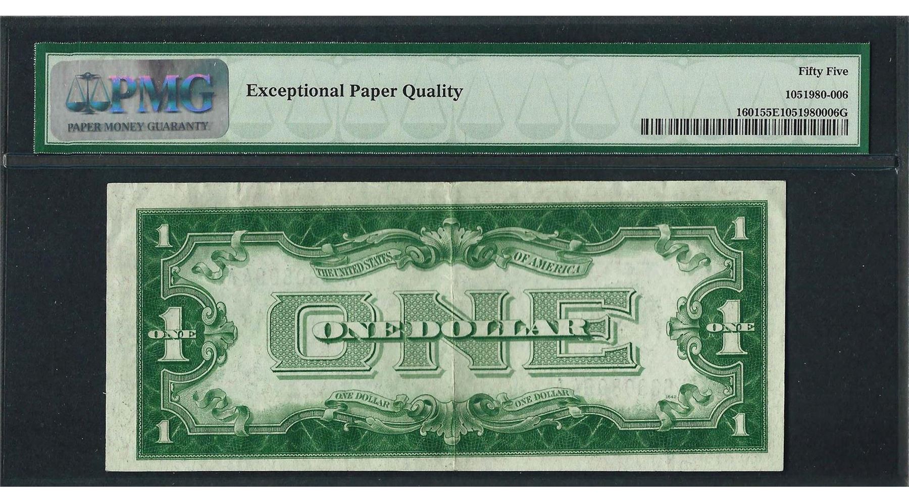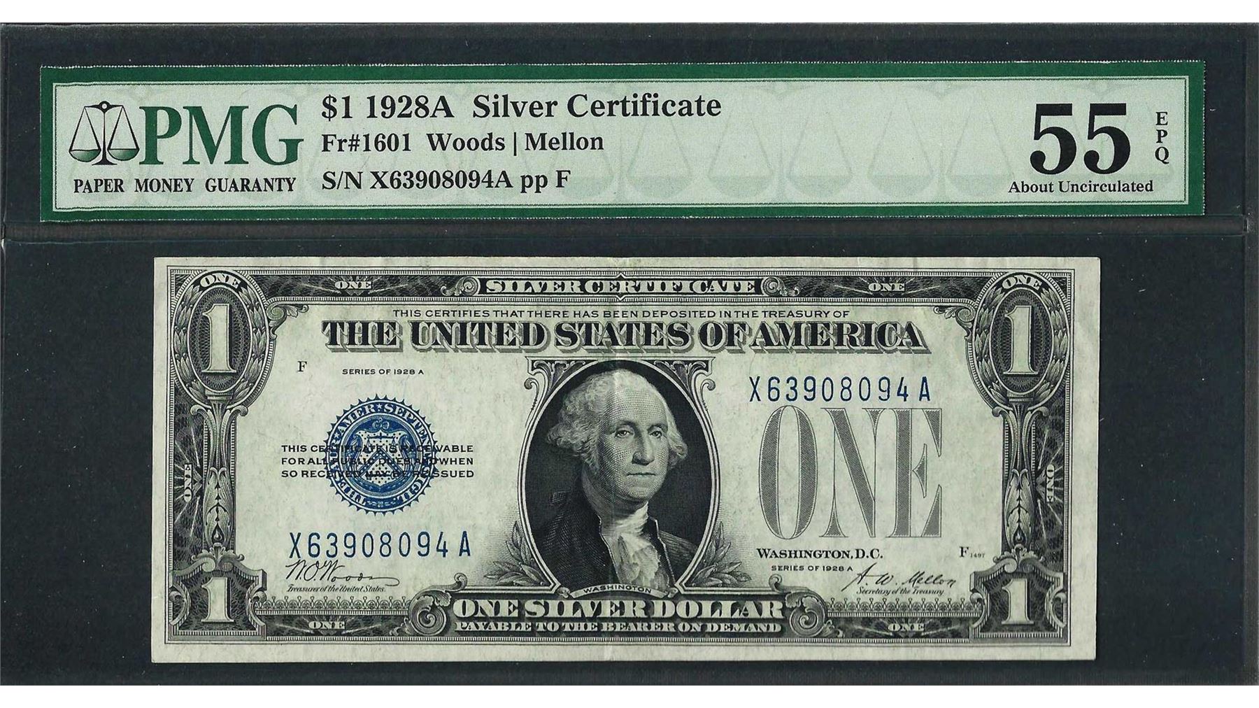 One 1928A $1 Funnyback Silver Certificate Note Fr.1601 PMG About Uncirculated 55EPQ. PMG Certified.