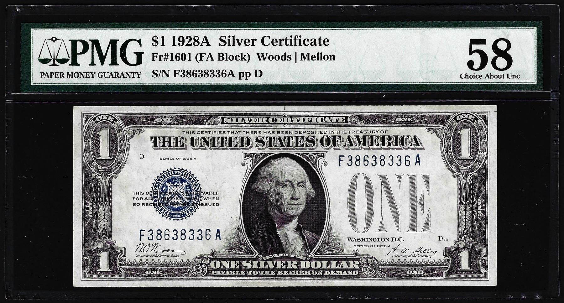 One 1928A $1 Funnyback Silver Certificate Note Fr.1601 PMG Choice About Uncirculated 58.