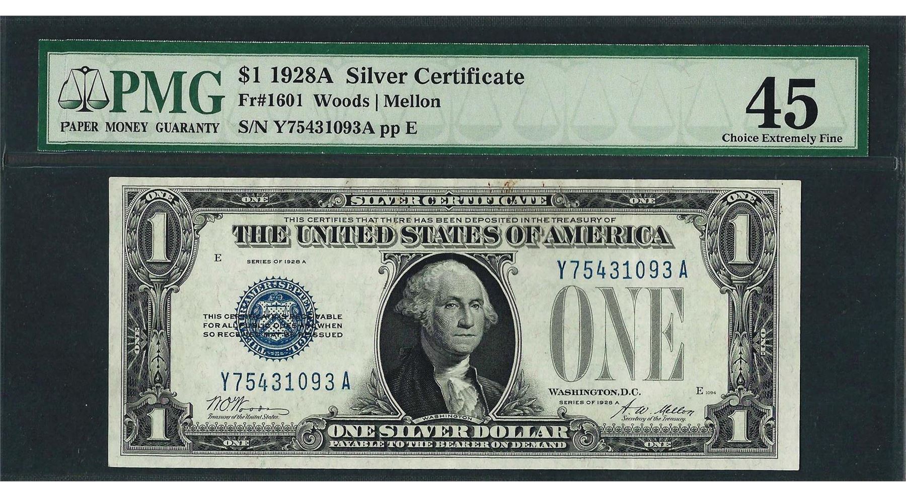 One 1928A $1 Funnyback Silver Certificate Note Fr.1601 PMG Choice Extremely Fine 45. PMG Certified.