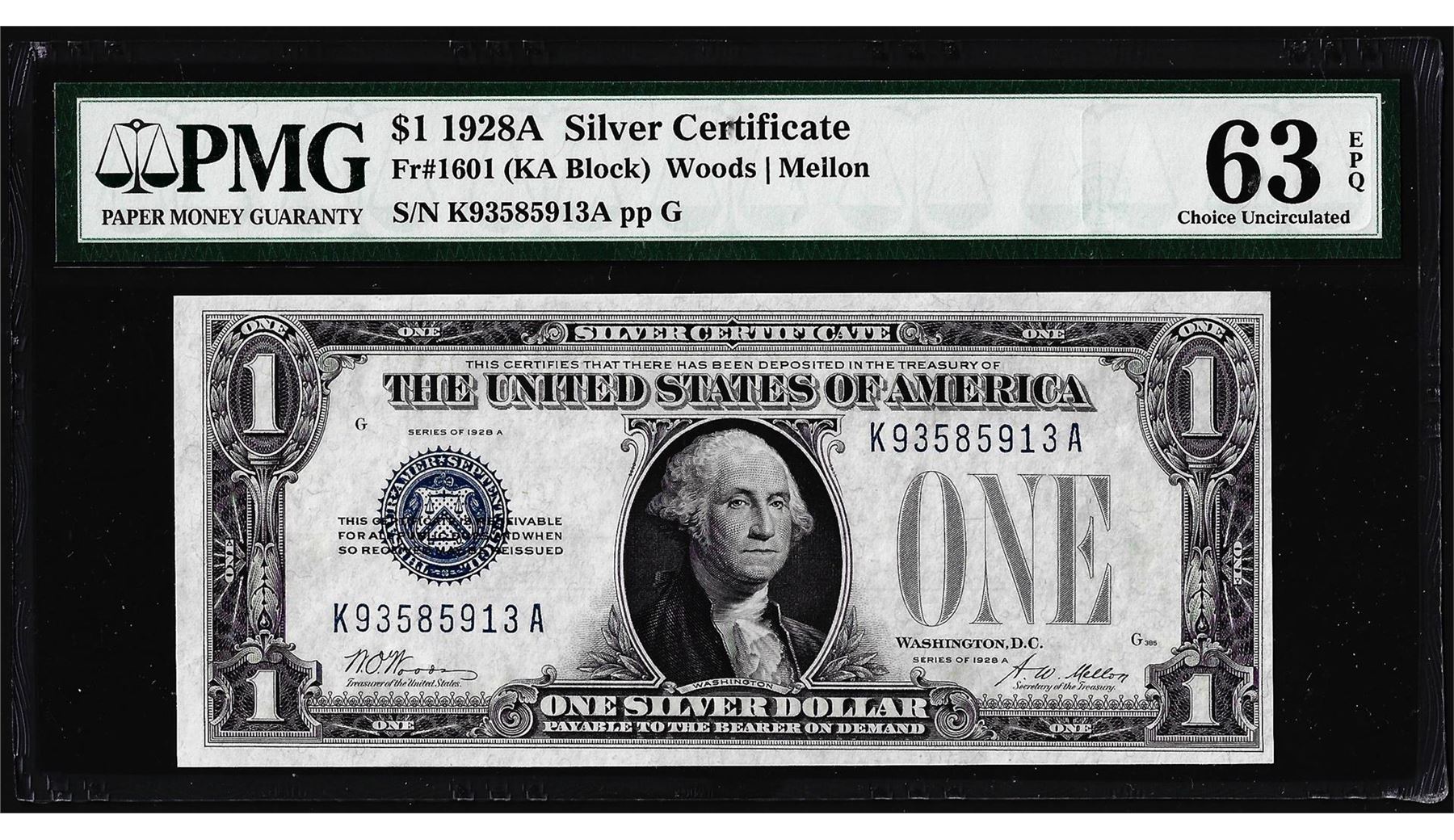 One 1928A $1 Funnyback Silver Certificate Note Fr.1601 PMG Choice Uncirculated 63EPQ. PMG Certified.