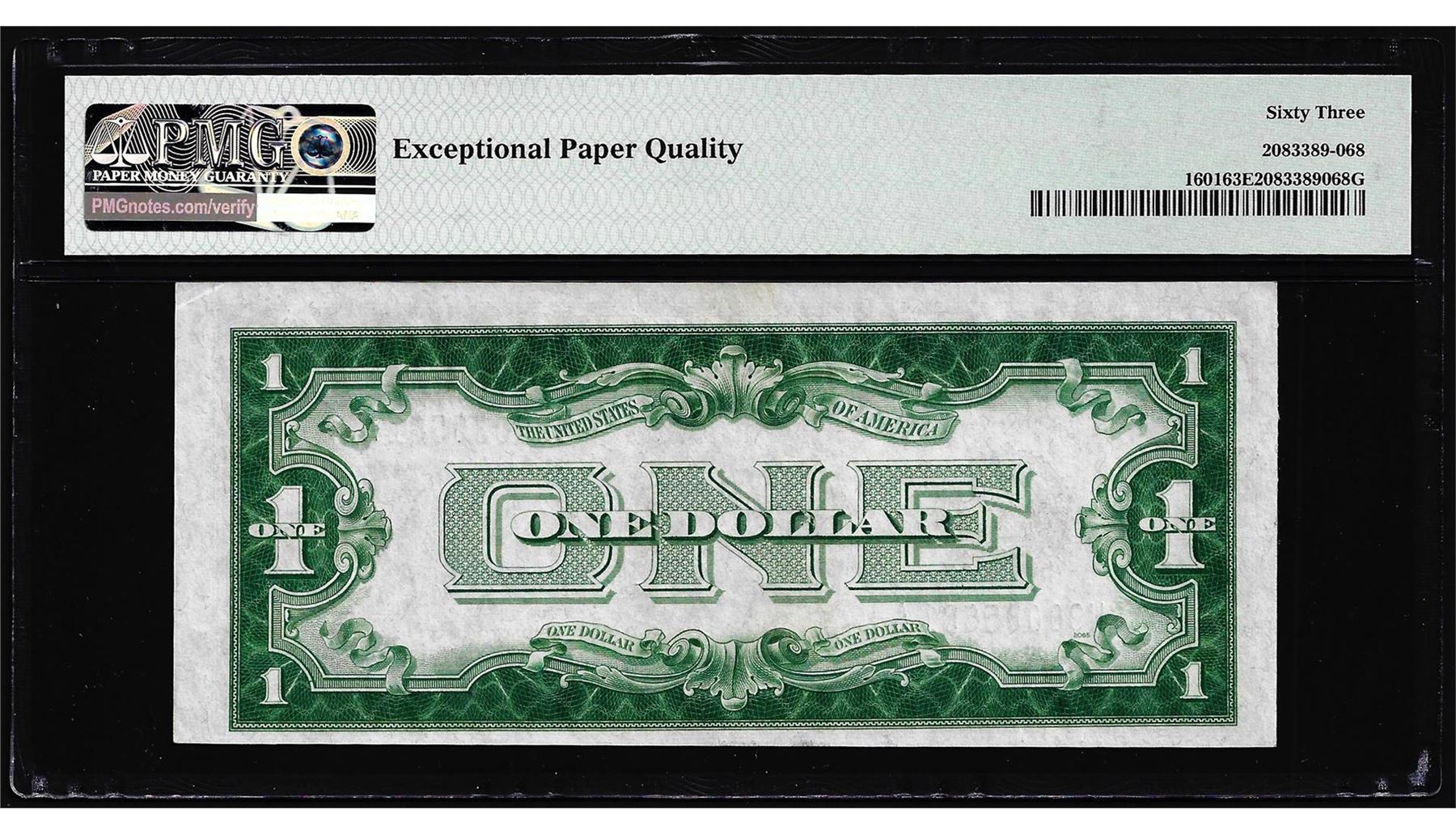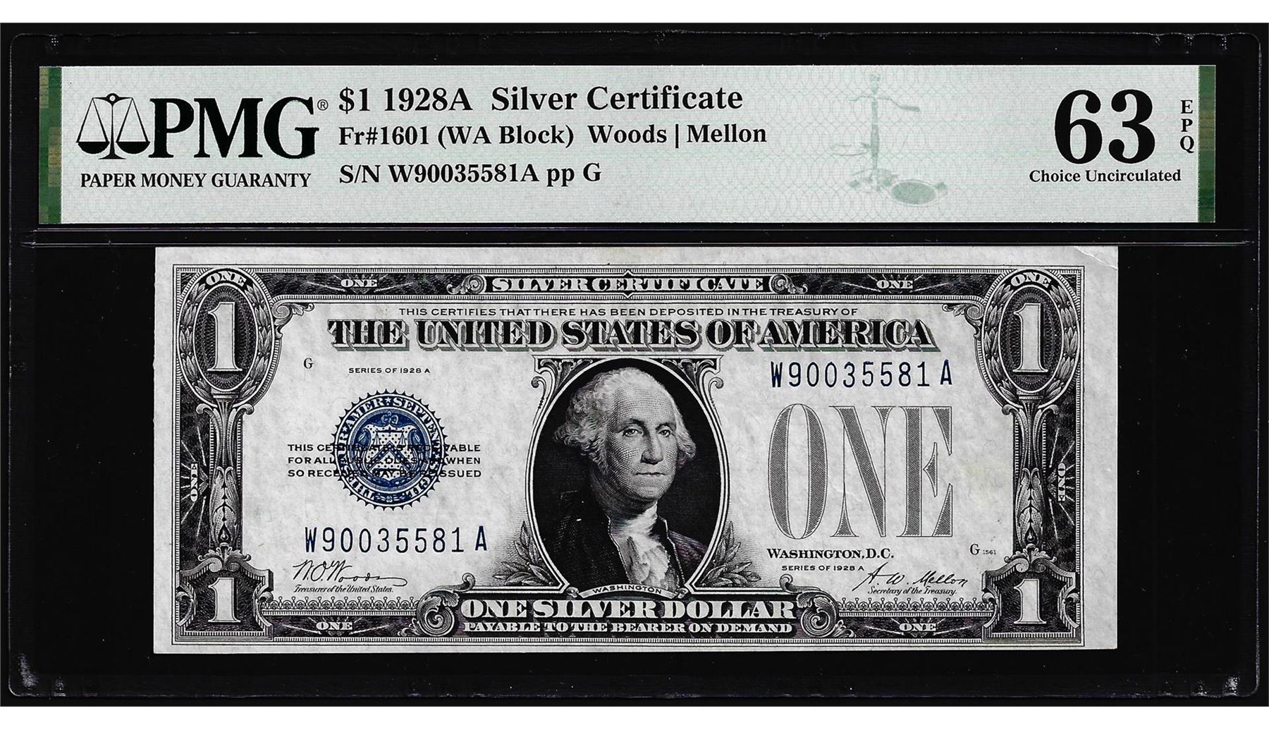 One 1928A $1 Funnyback Silver Certificate Note Fr.1601 PMG Choice Uncirculated 63EPQ. PMG Certified.