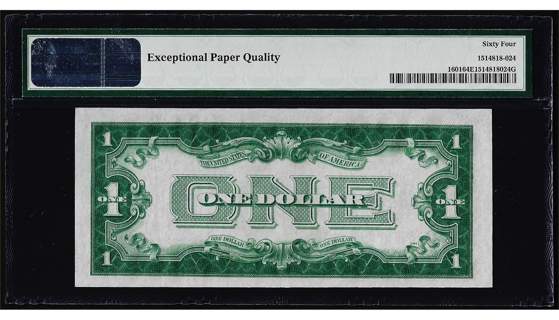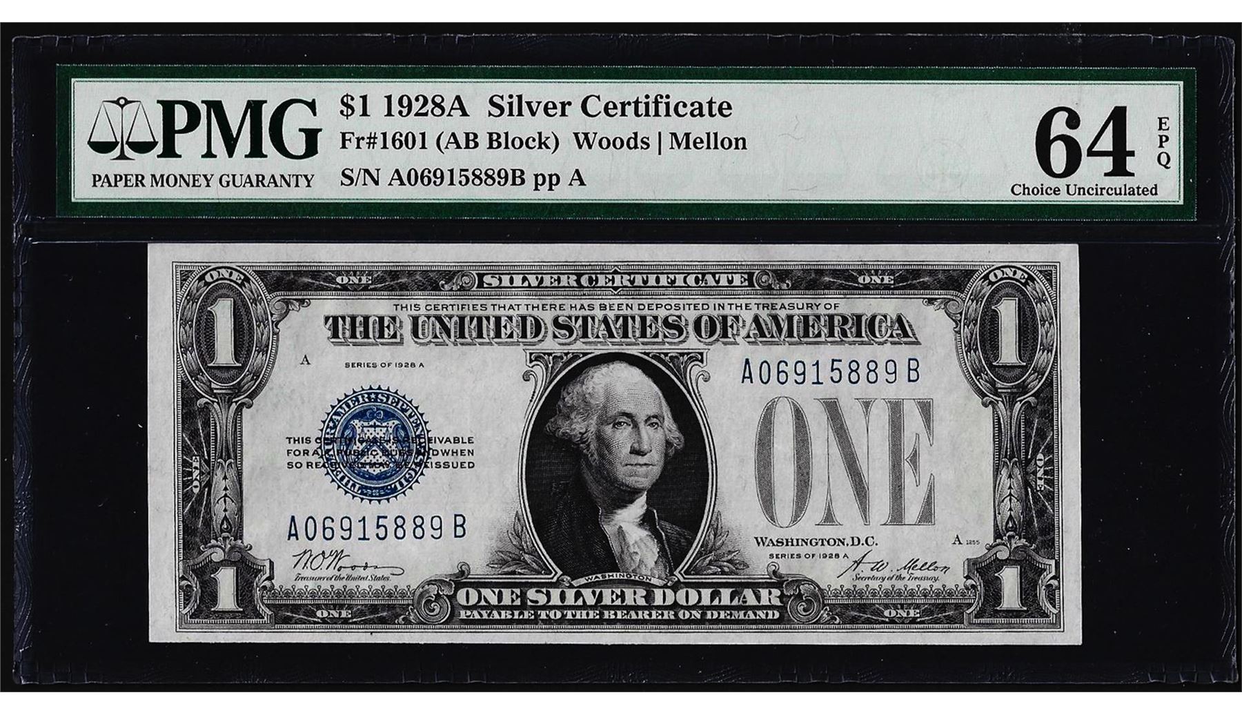 One 1928A $1 Funnyback Silver Certificate Note Fr.1601 PMG Choice Uncirculated 64EPQ. PMG Certified.