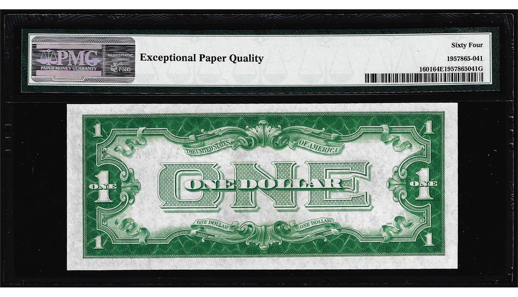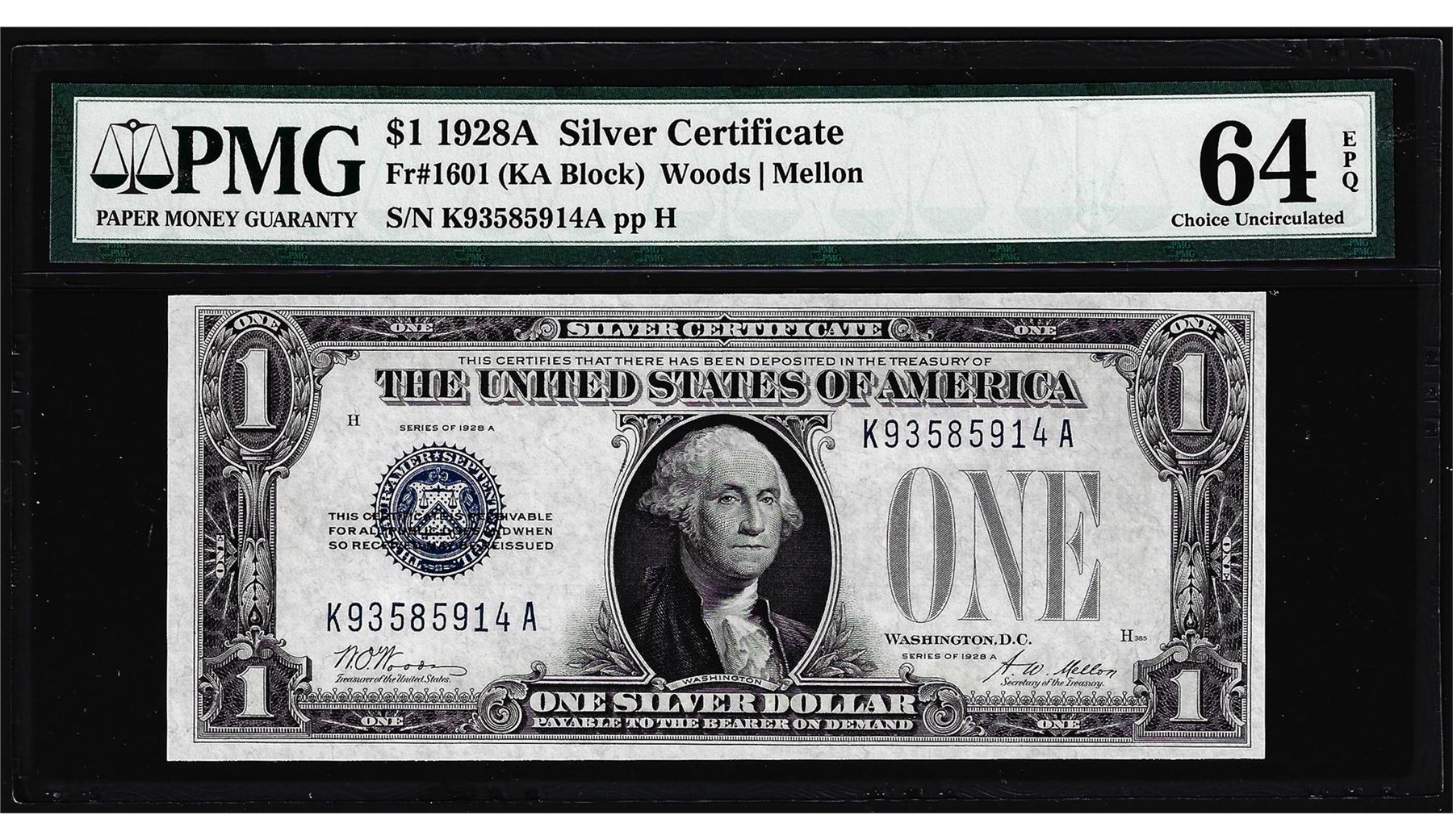 One 1928A $1 Funnyback Silver Certificate Note Fr.1601 PMG Choice Uncirculated 64EPQ. PMG Certified.
