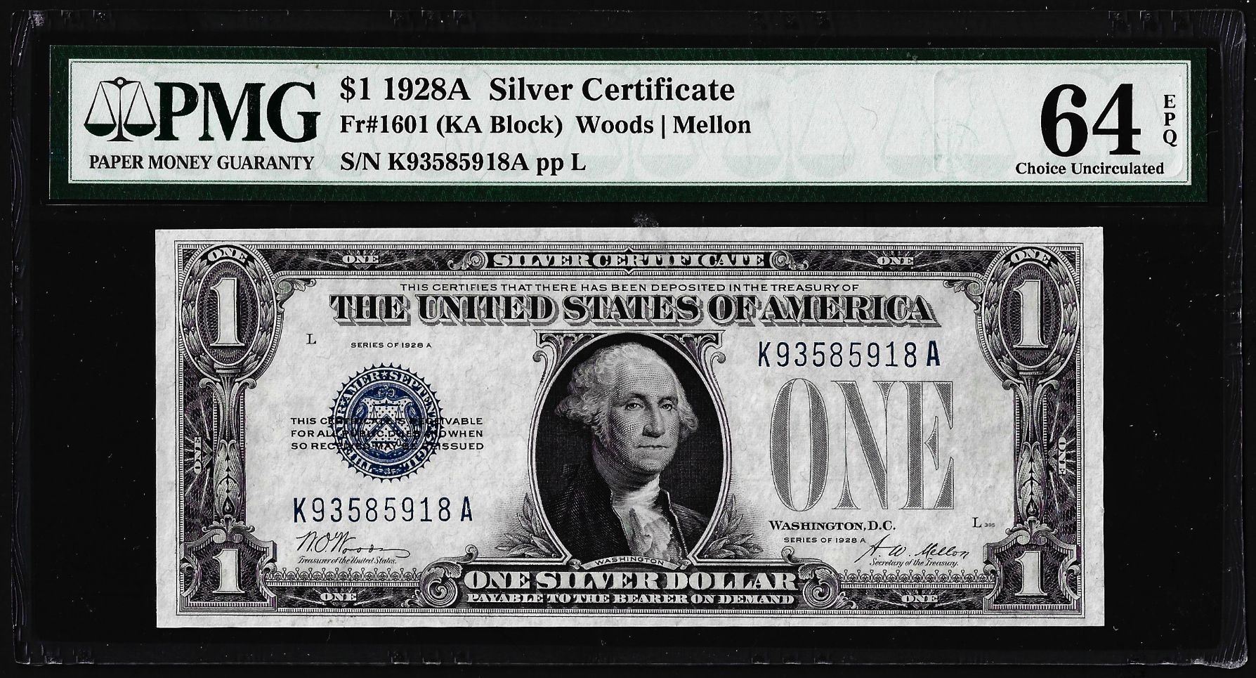 1928A $1 Funnyback Silver Certificate Note Fr.1601 PMG Choice Uncirculated 64EPQ