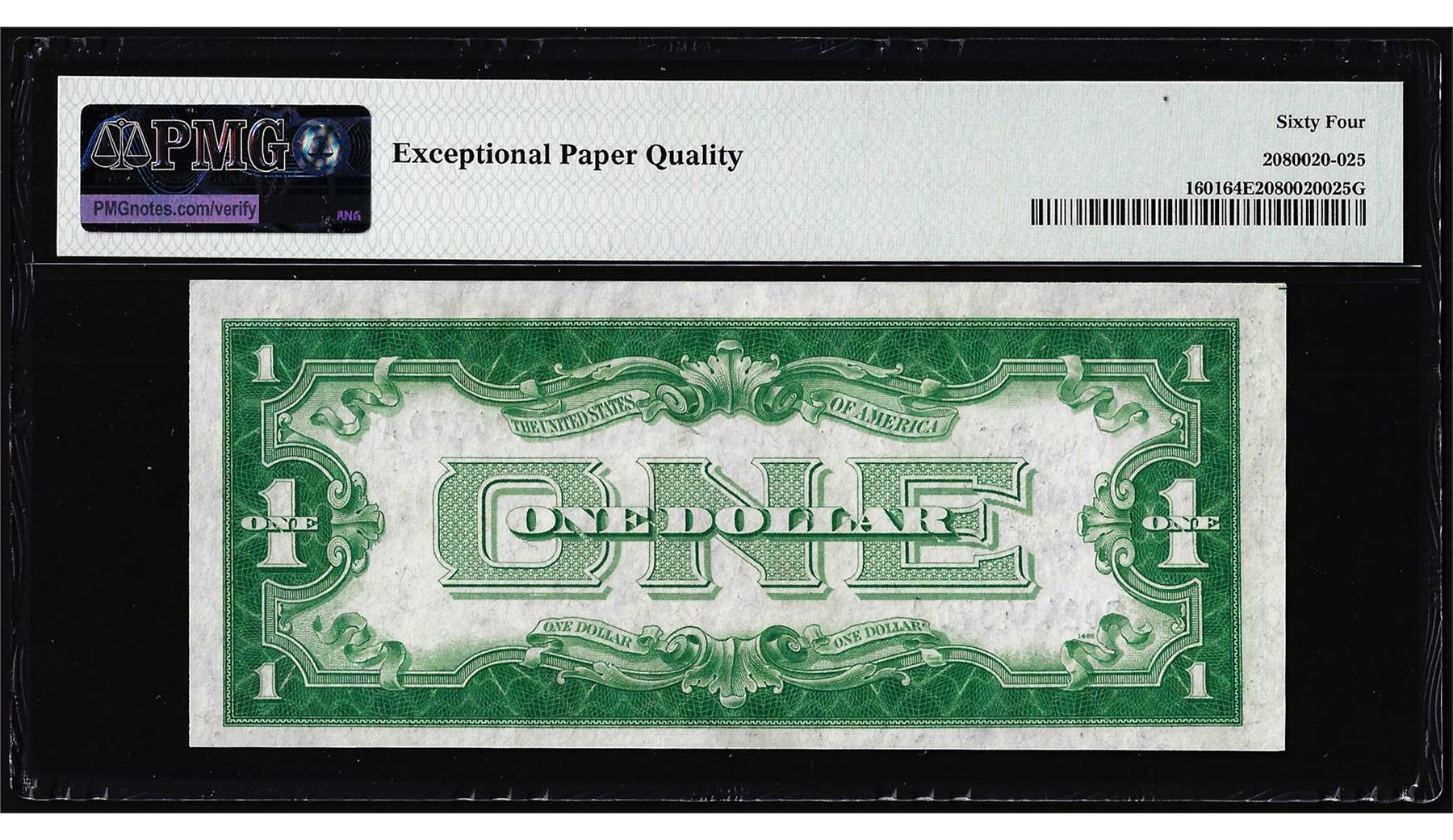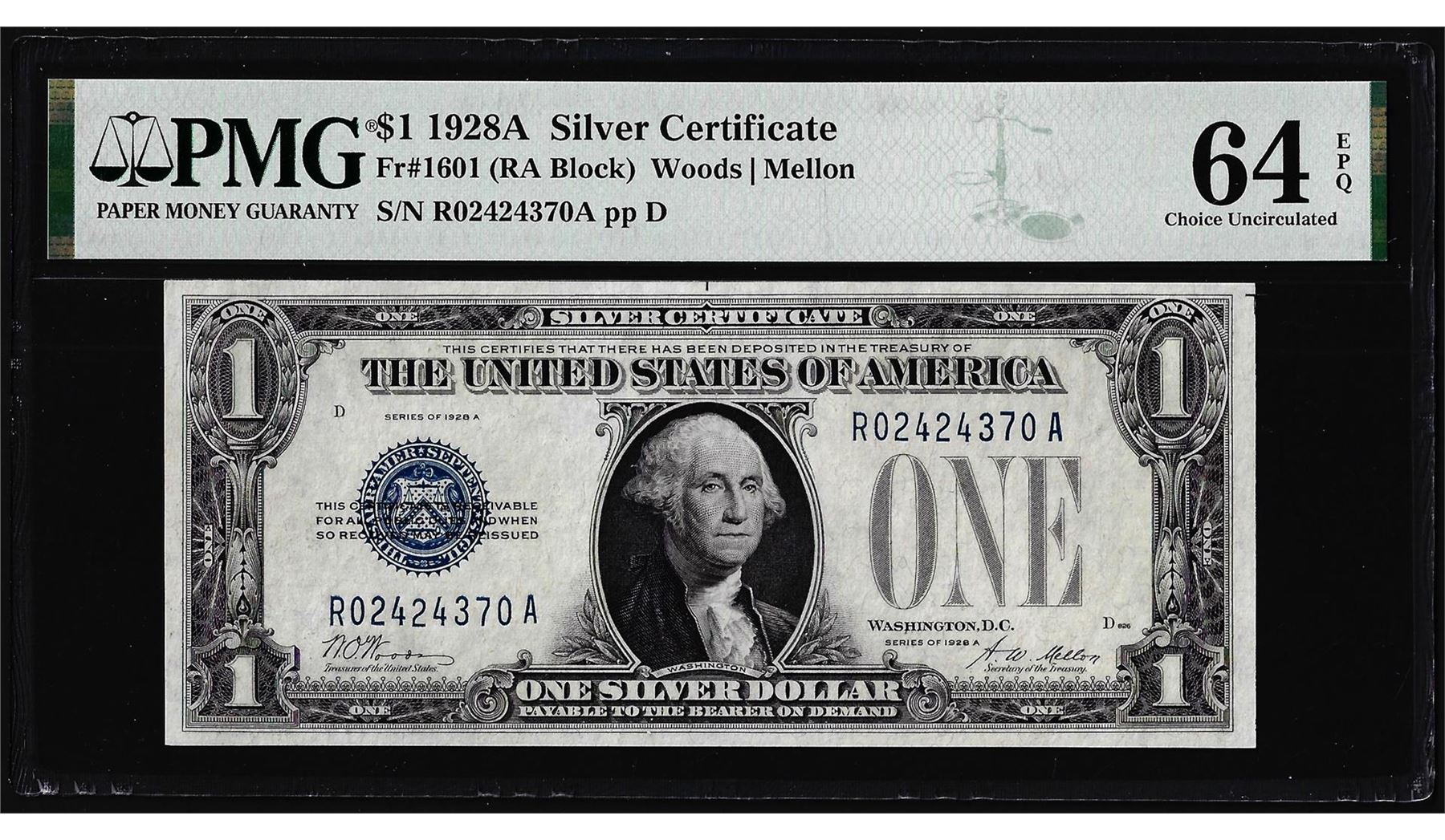 One 1928A $1 Funnyback Silver Certificate Note Fr.1601 PMG Choice Uncirculated 64EPQ. PMG Certified.