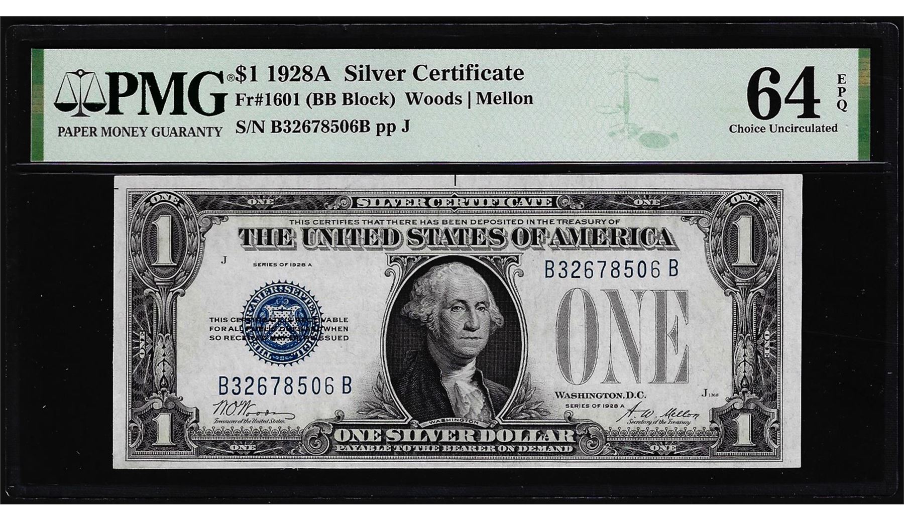 One 1928A $1 Funnyback Silver Certificate Note Fr.1601 PMG Choice Uncirculated 64EPQ. PMG Certified.
