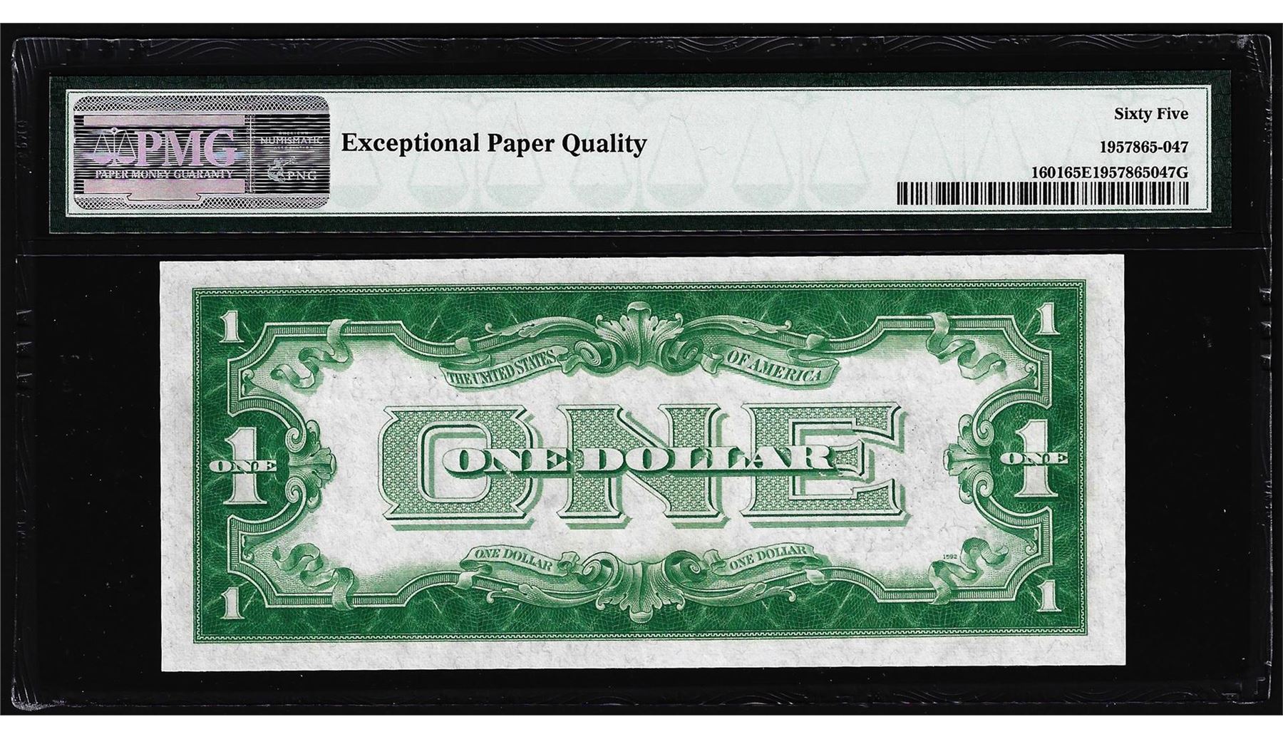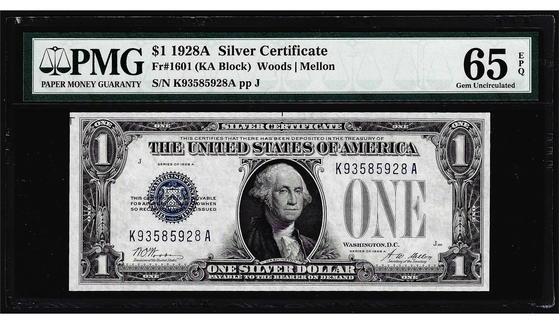 One 1928A $1 Funnyback Silver Certificate Note Fr.1601 PMG Gem Uncirculated 65EPQ. PMG Certified.