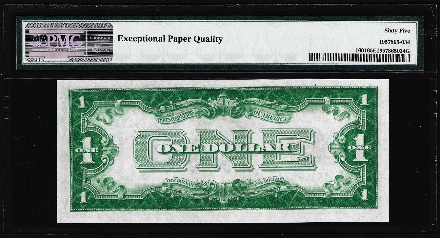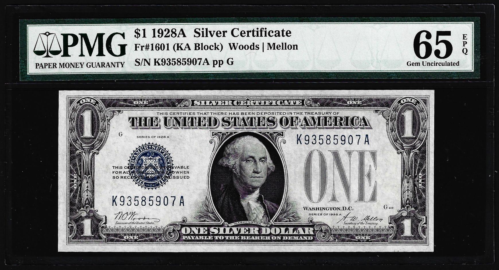 One 1928A $1 Funnyback Silver Certificate Note Fr.1601 PMG Gem Uncirculated 65EPQ.