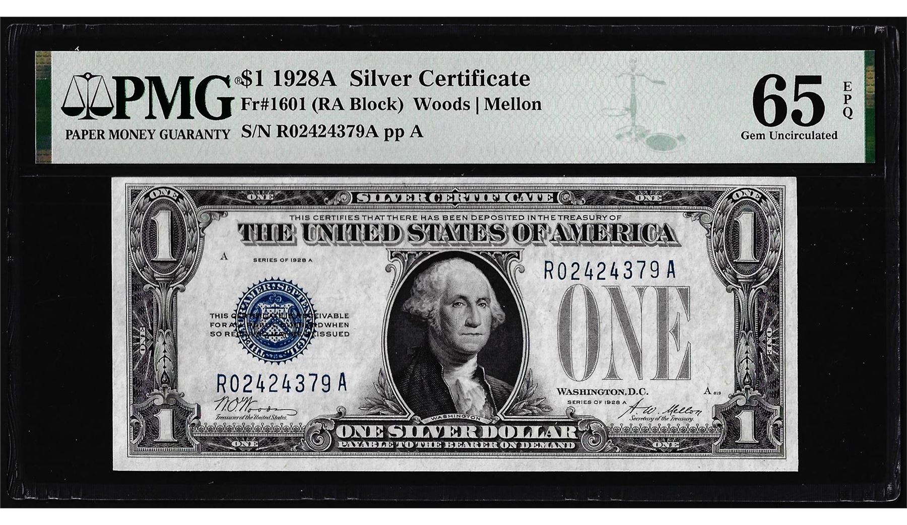 One 1928A $1 Funnyback Silver Certificate Note Fr.1601 PMG Gem Uncirculated 65EPQ. PMG Certified.