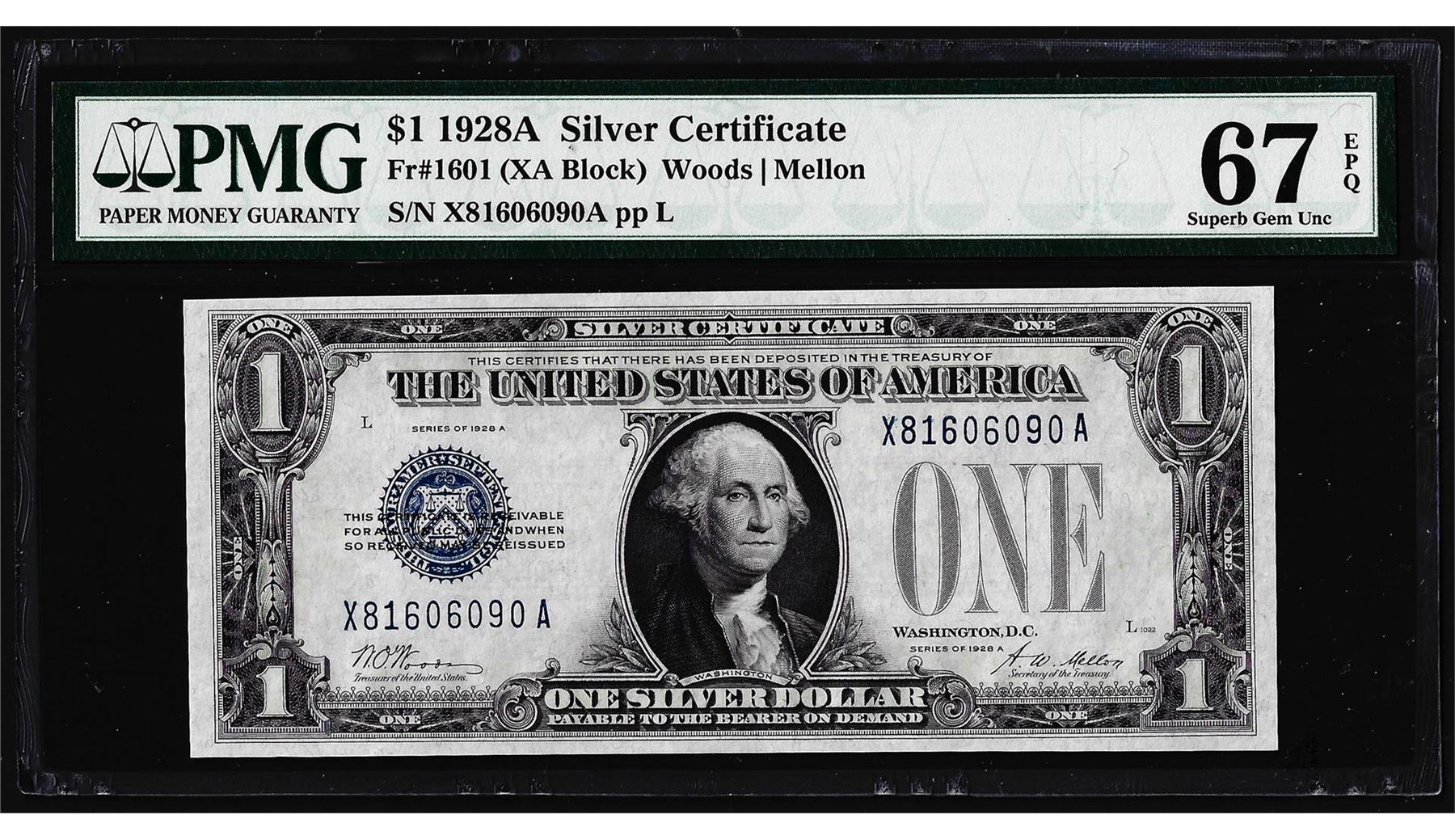 One 1928A $1 Funnyback Silver Certificate Note Fr.1601 PMG Superb Gem Uncirculated 67EPQ. PMG Certified.