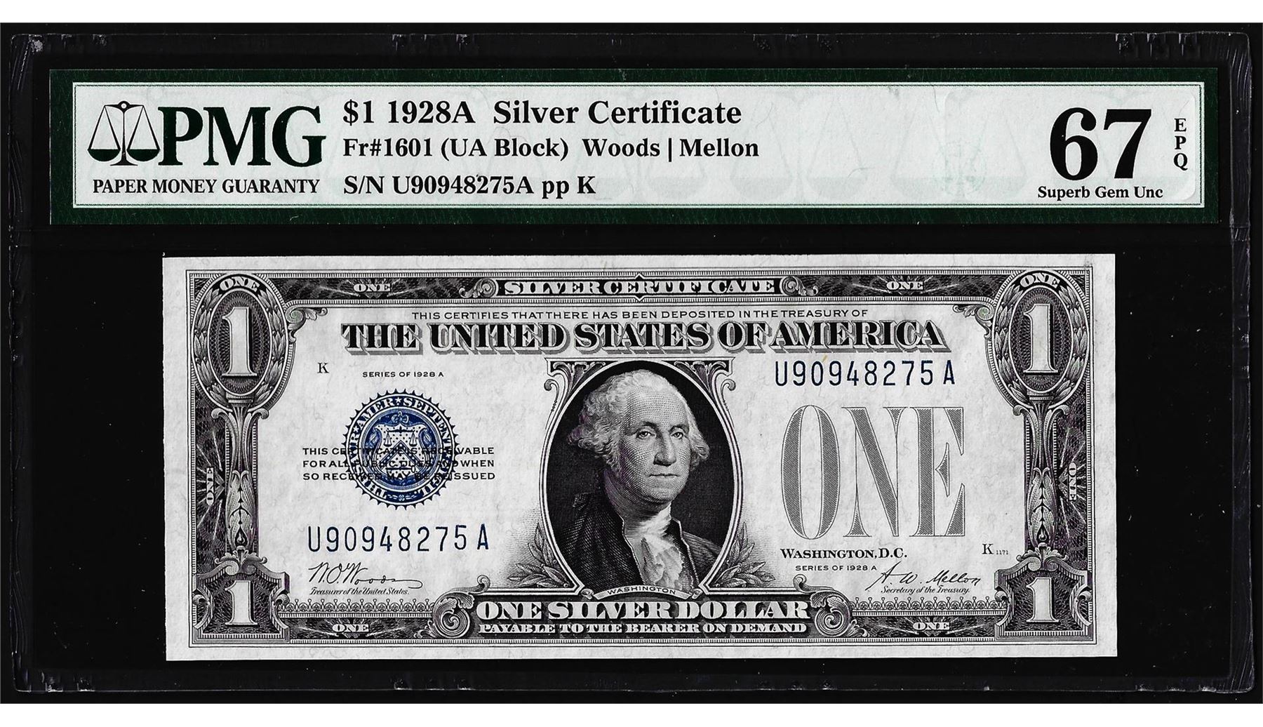One 1928A $1 Funnyback Silver Certificate Note Fr.1601 PMG Superb Gem Uncirculated 67EPQ. PMG Certified.