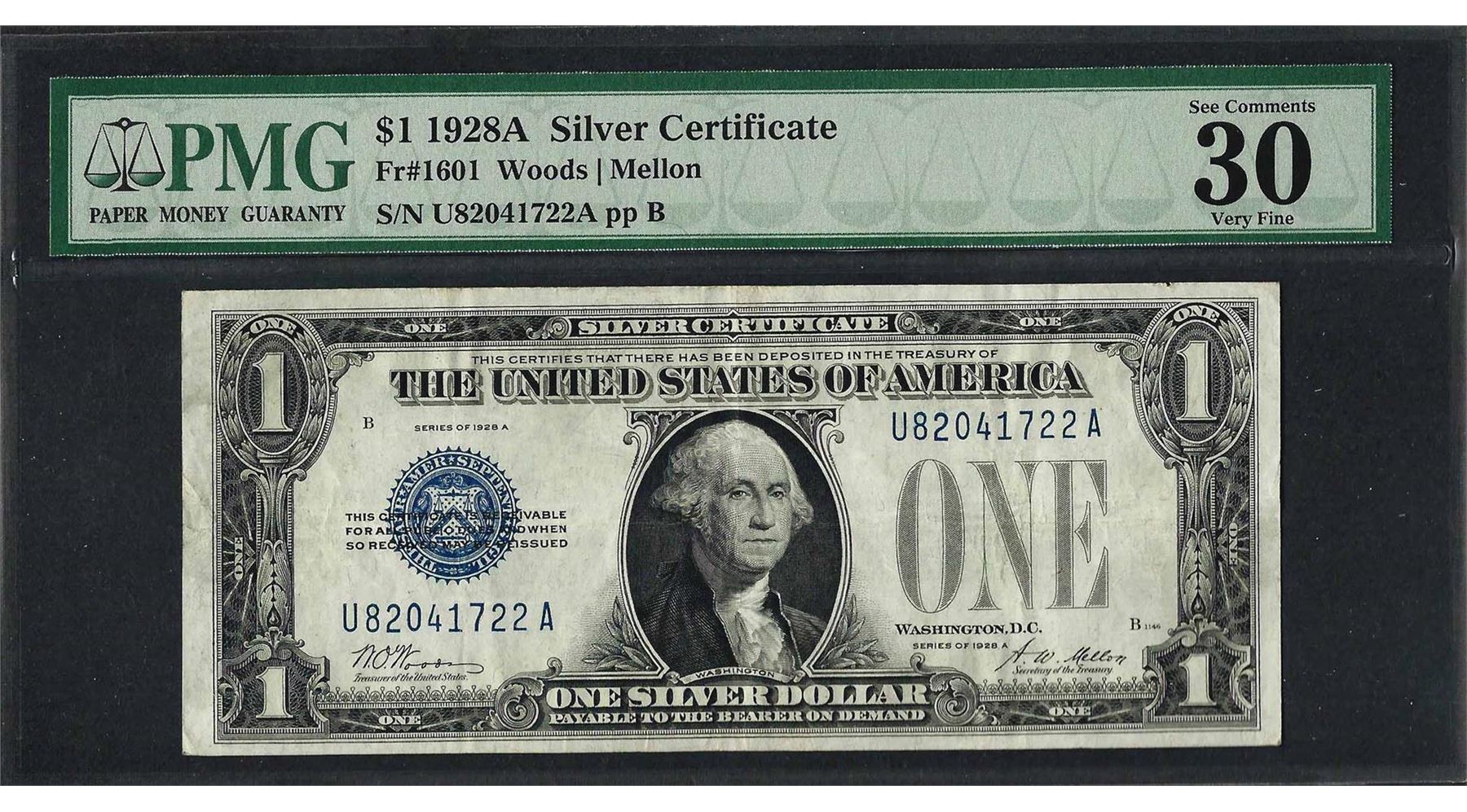 One 1928A $1 Funnyback Silver Certificate Note Fr.1601 PMG Very Fine 30EPQ. PMG Certified.