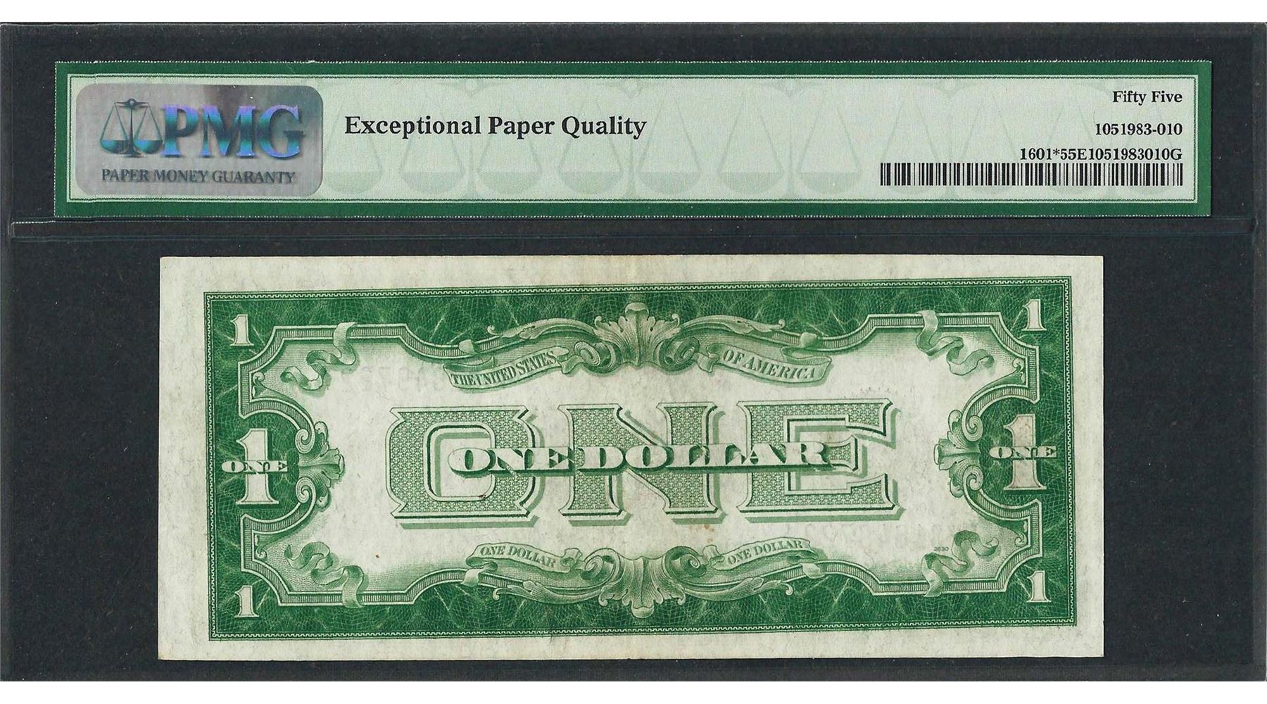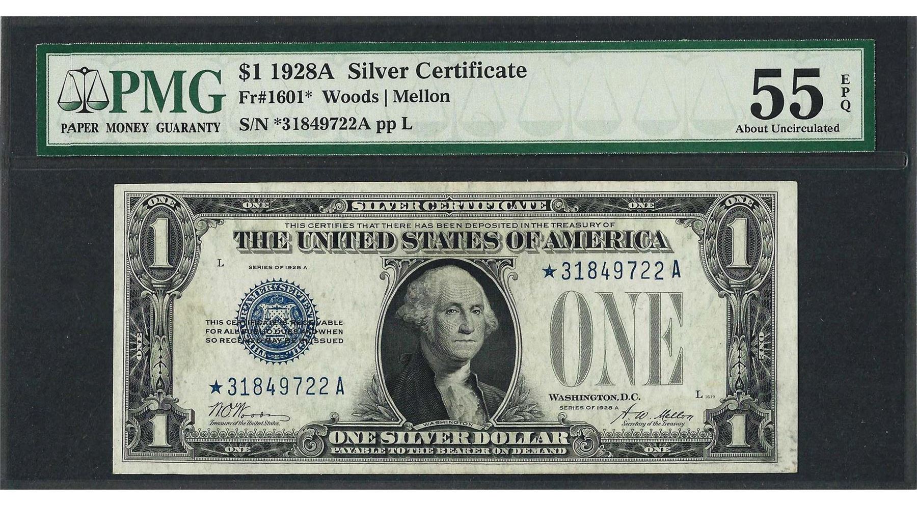 One 1928A $1 Funnyback Silver Certificate STAR Note Fr.1601* PMG About Uncirculated 55EPQ. PMG Certified.